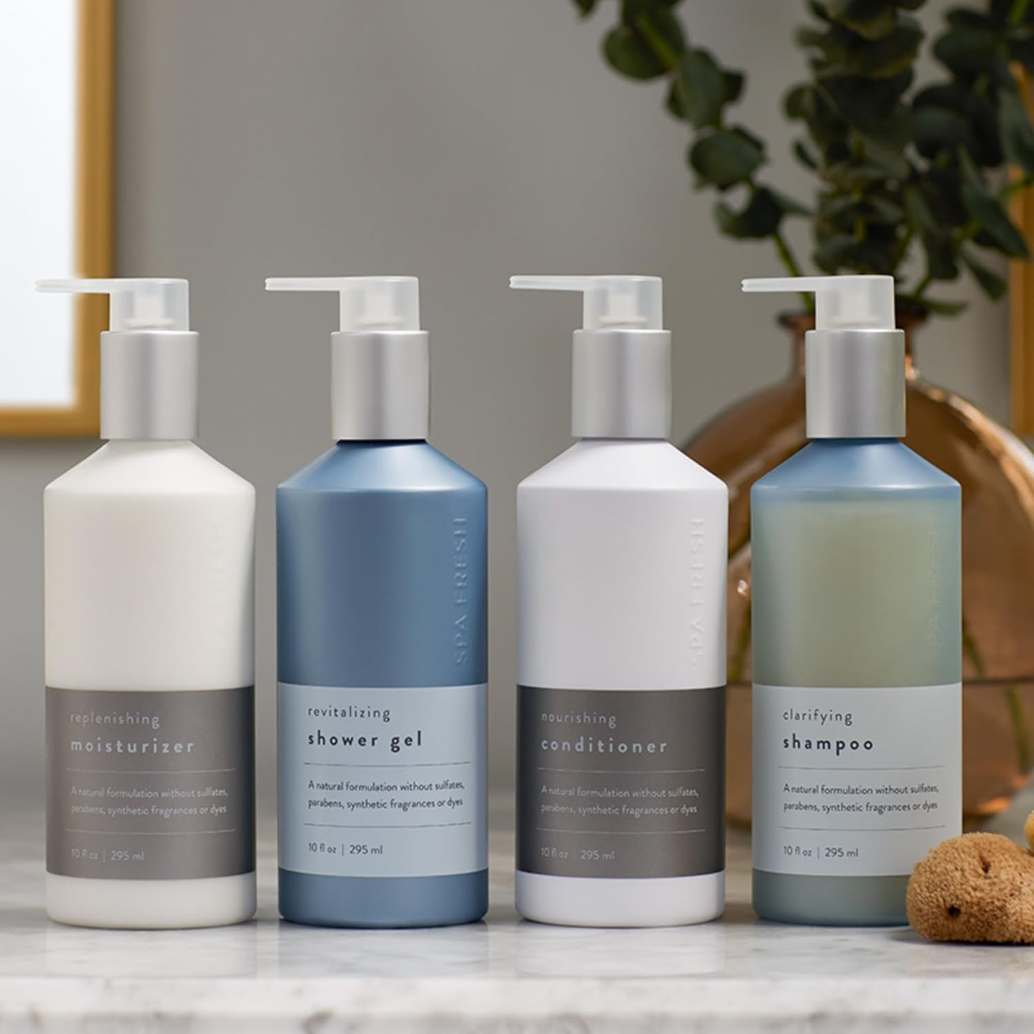 FOUR-PIECE SET INCLUDES - one (1) 10-ounce bottle of Spa Fresh Clarifying Shampoo, Balancing Conditioner, Replenishing Moisturizer and Purifying Shower Gel.