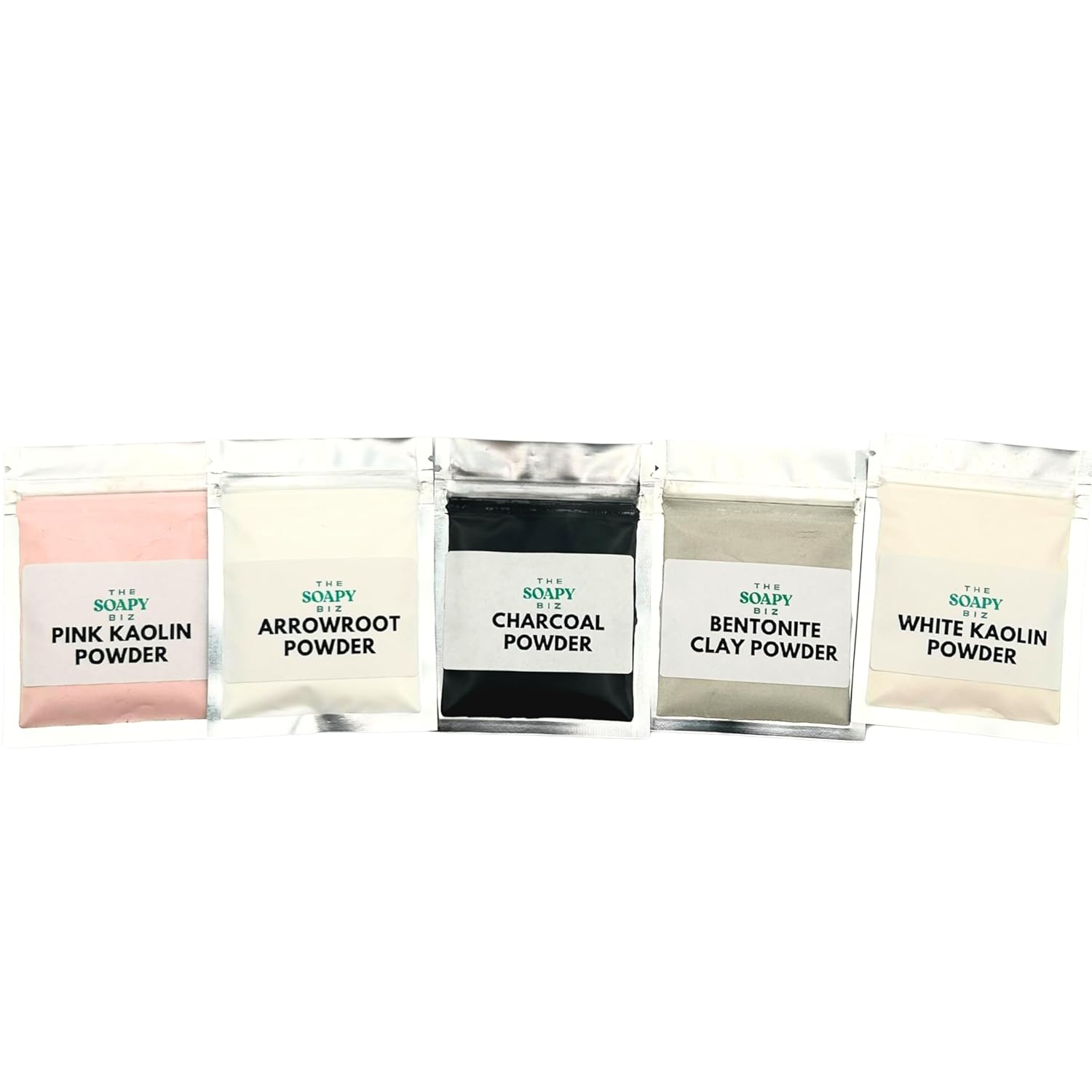 Five Premium Ingredients – Includes White Kaolin, Pink Kaolin, Bentonite, Arrowroot, and Activated Charcoal powders.