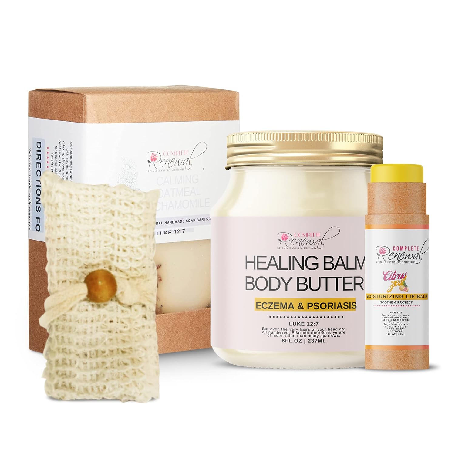 Ultimate Skin Care Set - Nurture your delicate skin with Complete Renewal’s self care kit! Our 4-piece care package includes a jar of whipped body butter, lavender + chamomile soap, soothing lip balm, and mesh cloth.