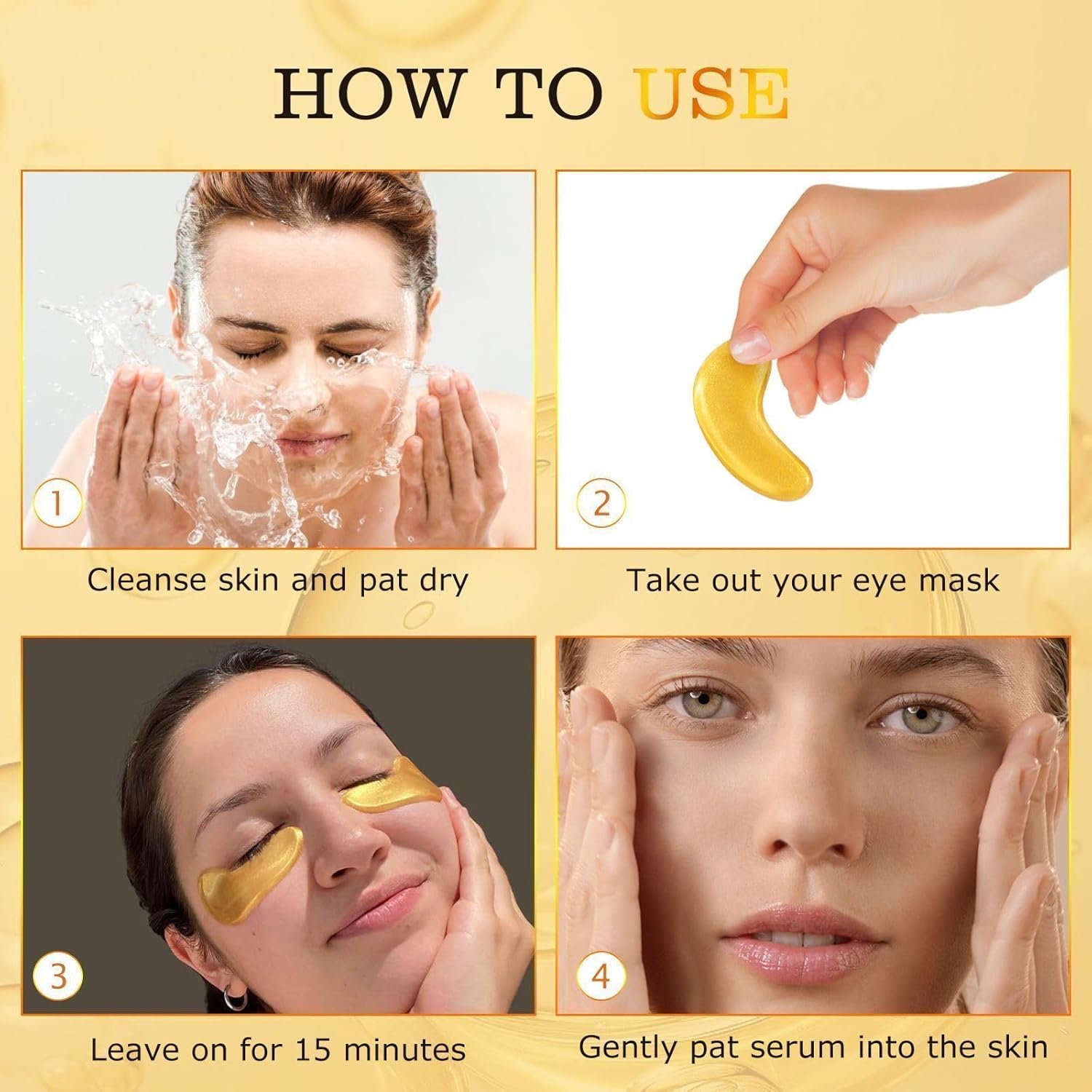 Easy to Use: Under-eye treatments at skin care centers are expensive and time-consuming, with no guarantee of results. This gold eye mask is not only very easy to use, it is also exceptionally effective. Simply apply our eye mask under your eyes after cleansing with warm water, press gently to hold in place, and leave on for 15-20 minutes. Remove the mask and pat the remaining serum until it is completely absorbed. Give our eye mask a chance and it will give you the ultimate care