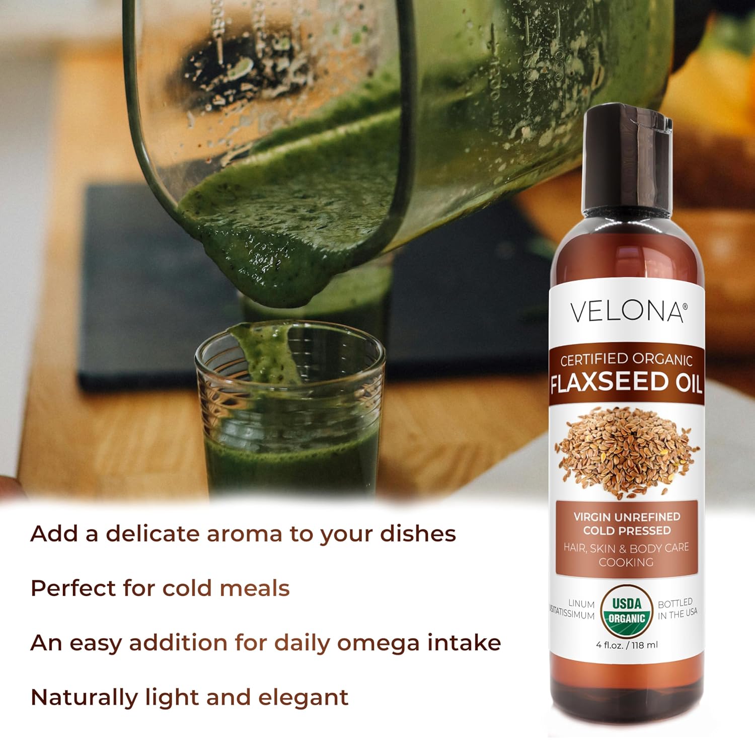 Velona USDA Certified Organic Flaxseed Oil: 100% Pure and Natural Carrier Oil. Unrefined. Cold Pressed. Not Diluted, Non-GMO, No Additives, No Fragrance, Chemical Free, Alcohol Free.