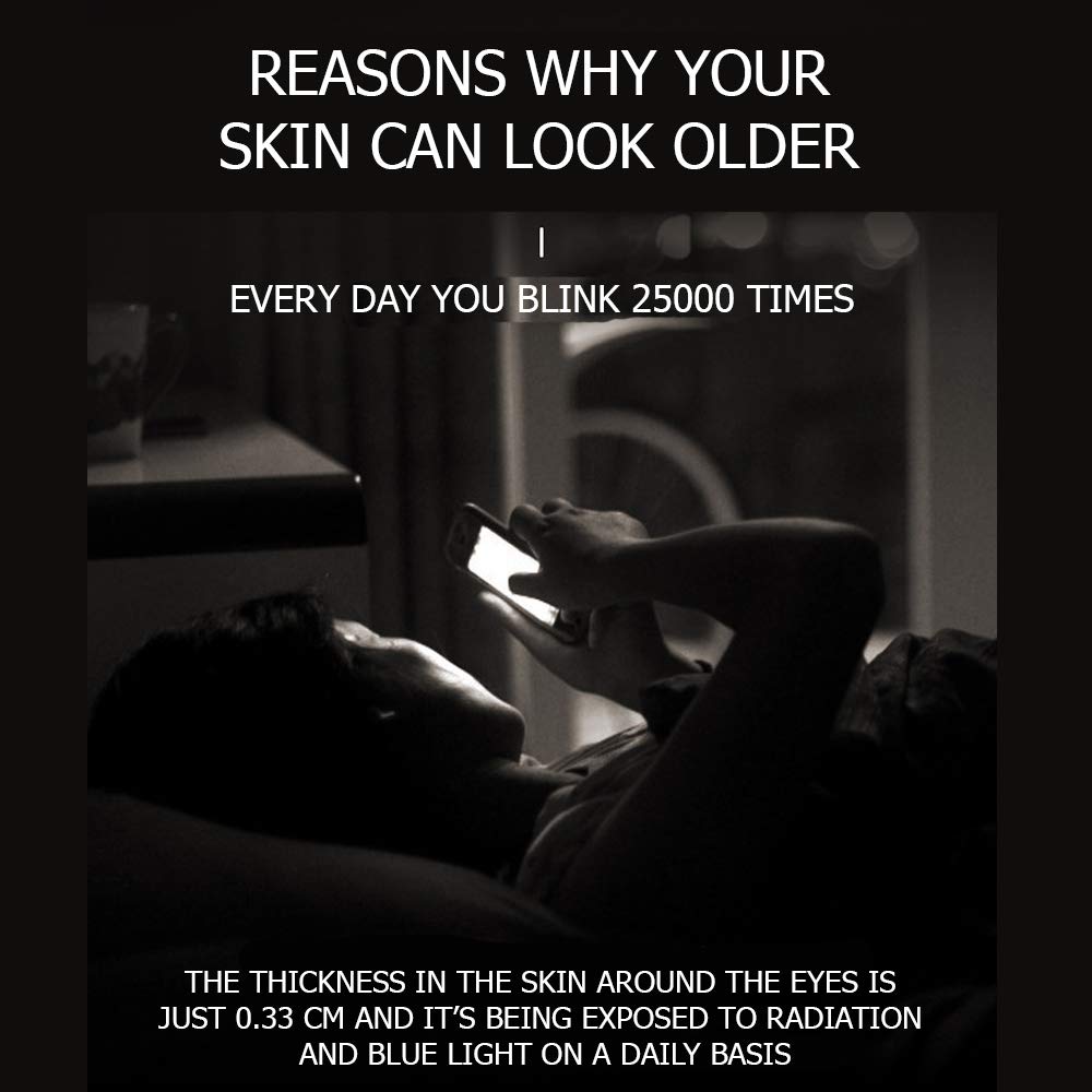 Every day you bling 25000 times! The thickness of the skin around the eyes is just 0 33 cm and it’s being exposed to radiation and blue light on a daily basis.
