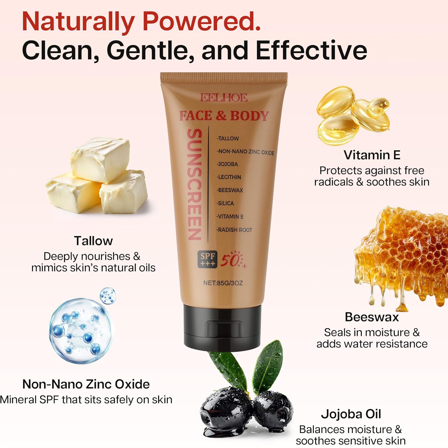 【Water & Sweat Resistant Formula】Designed to stay on through beach days, hikes, and sports, our tallow sunscreen holds up well against water and sweat—ideal for active routines or family use.
