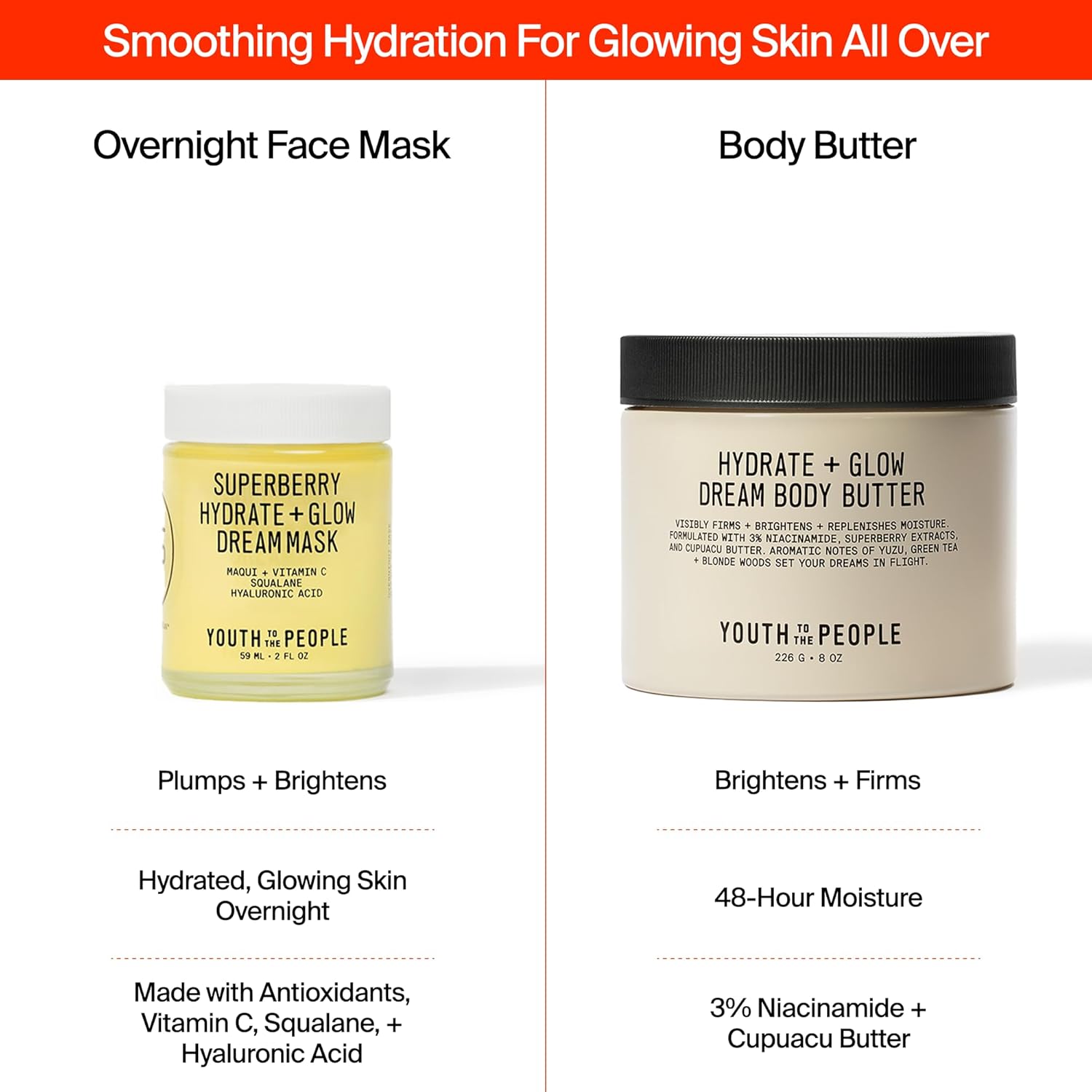 Youth To The People Radiant Skin Face + Body Moisturizer Duo, Vegan Skincare Bundle Set for All Day Glow, Superberry Hydrate + Glow Overnight Face Mask (2oz) + Dream Scented Body Butter (8oz)