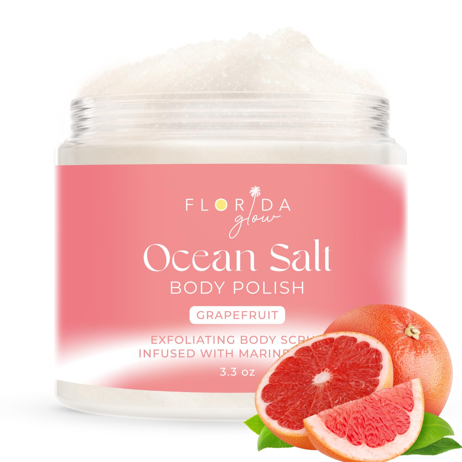 Sea Salt Body Scrub by Florida Suncare - Ocean Salt Body Polish Infused with Marine Algae - Exfoliating Face and Body Scrub - Facial Scrub Exfoliator to Tackle Acne and Scars (Coconut Mango, 3.3 oz)