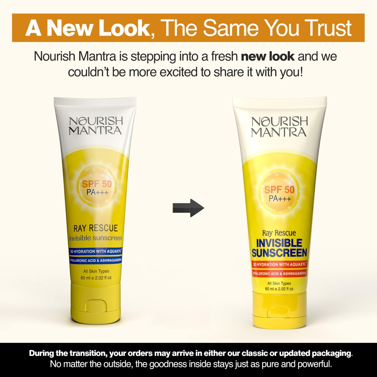 NOURISH MANTRA Ray Rescue Sunscreen/Sunscreen SPF 50/ With Hyaluronic Acid, Aquaxyl, Aloe Vera Extracts & Ashwagandha Extracts/No White Cast, (60 ml (Pack of 1))