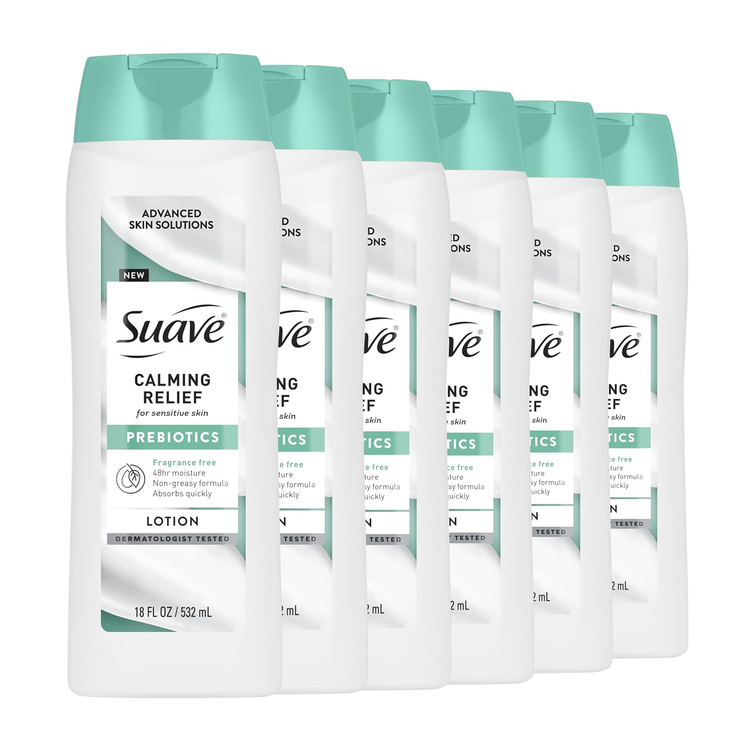 Suave Calming Relief Hand & Body Lotion for Women With Prebiotics For Sensitive Skin, Fragrance & Allergen Free, Helps Restore Skin's Moisture Barrier, 18 FL OZ, 6 Pack