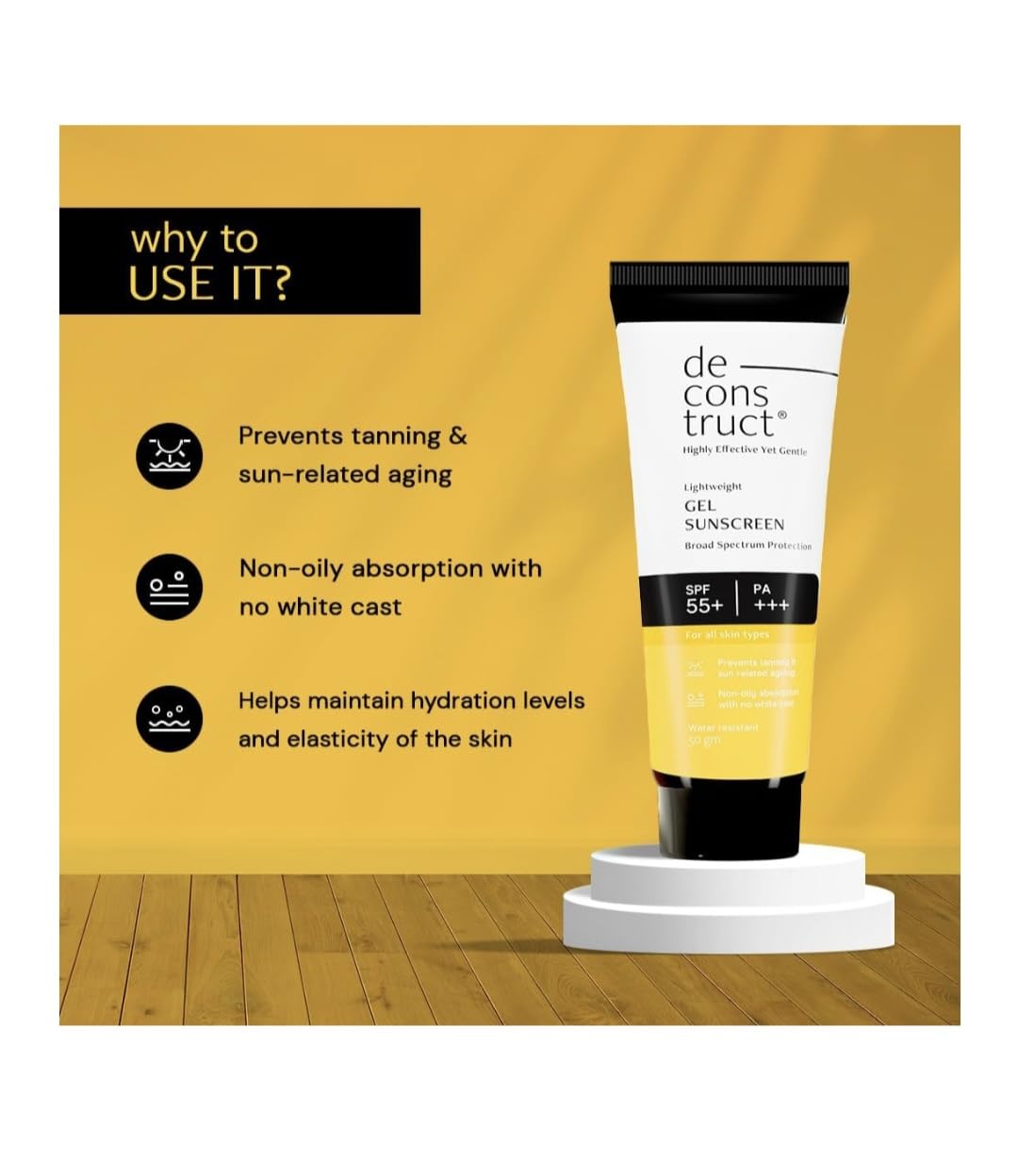 De Construct Lightweight Gel Sunscreen, SPF 55+ PA+++, Broad Spectrum Protection, Non-Oily, No White Cast, Water Resistant, 50g