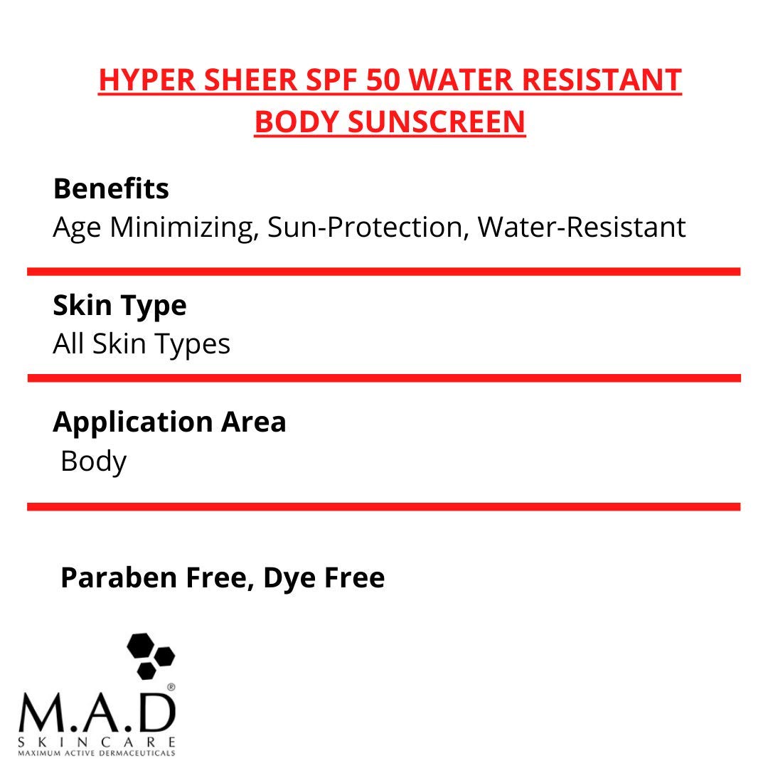 M.A.D SKINCARE SOLAR PROTECTION: Hyper Sheer SPF 50 Water Resistant Body Sunscreen - 120g