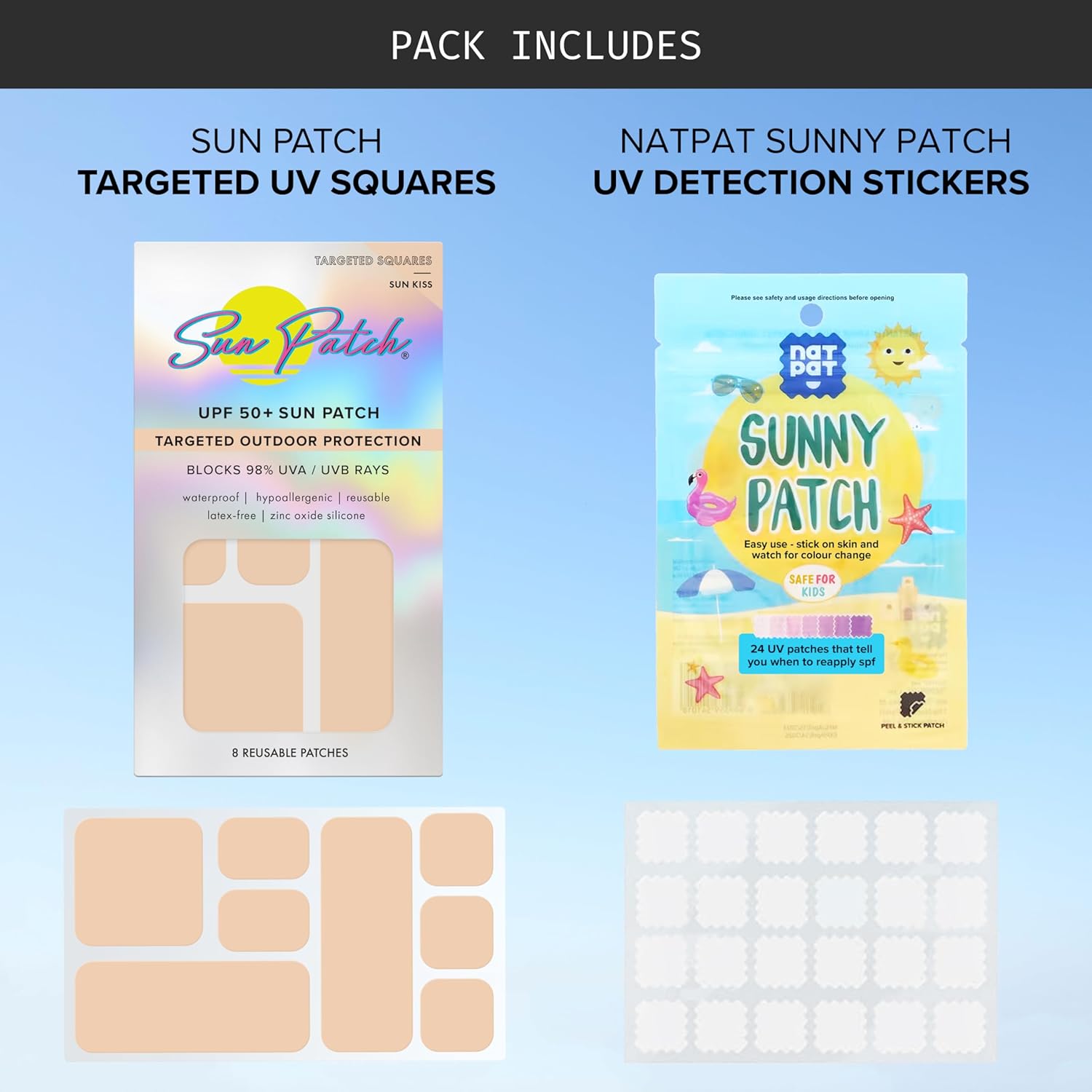 SAVE $10 Sun Patch UV Protection Squares + NATPAT SunnyPatch UV Detection Stickers | Reusable UPF 50+ Face Patches + Color-Changing Sunscreen Reminder Stickers for Kids & Adults | Sun Safety Bundle