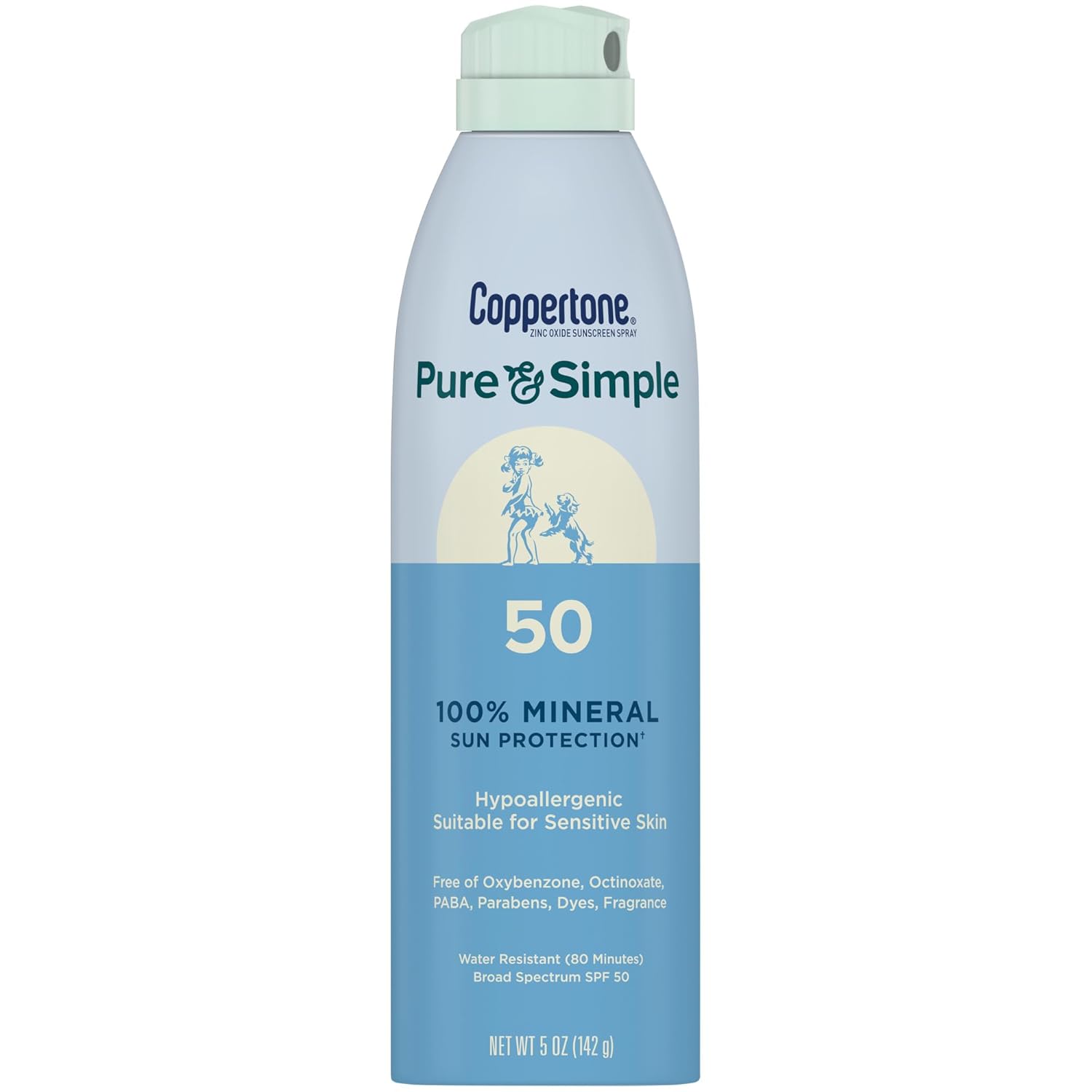 Coppertone Pure and Simple Zinc Oxide Mineral Sunscreen Spray SPF 50, Water Resistant, Broad Spectrum SPF 50 Sunscreen for Sensitive Skin, 5 Oz Spray