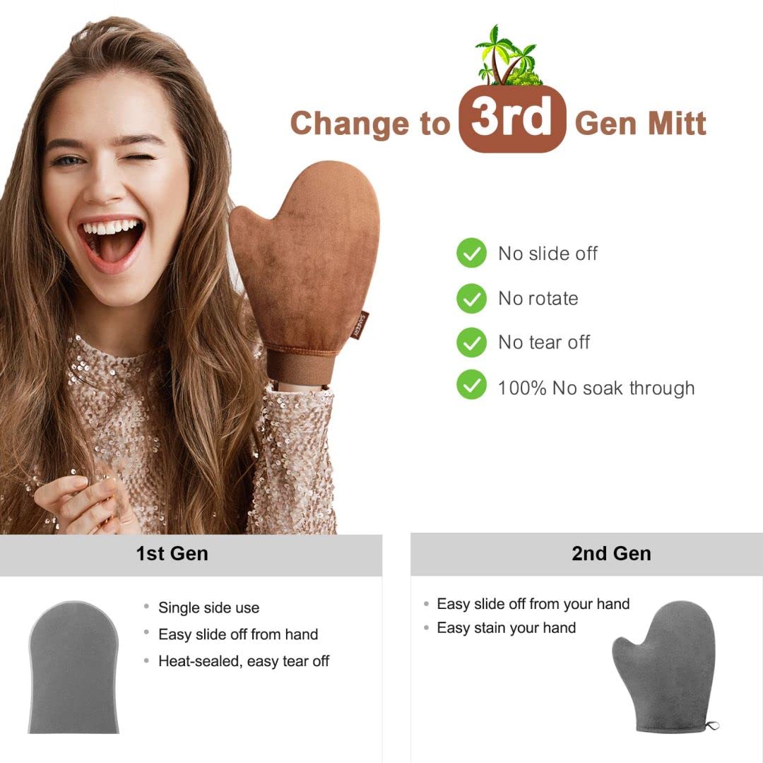 【TRY US PATENTED 3rd Gen No-Slide Tanning Mitten】Updated with Elastic cuff & Thumb Hole, super-secure, will never slide off, and give you more control, make it easier to use than others 1st and 2nd gen tanning mitt. Besides, the velvet fiber of the 3pcs self tanner mitt makes it super soft to your skin, even kids use it available, it is also the SECRET of applying tan lotion smoothly and evenly. And, all tanning mitt are DOUBLE-SIDED usable and velvet soft, friendly for left and right-hand use.
