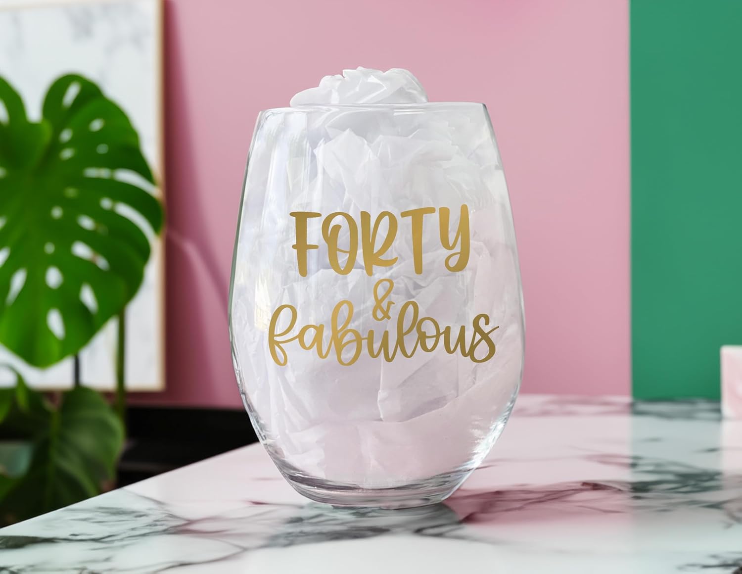 Stemless Wine Glass with permanent adhesive vinyl. Forty and Fabulous placed by hand and made to order. Wine glass is packaged in a white gift box with a care instruction card.