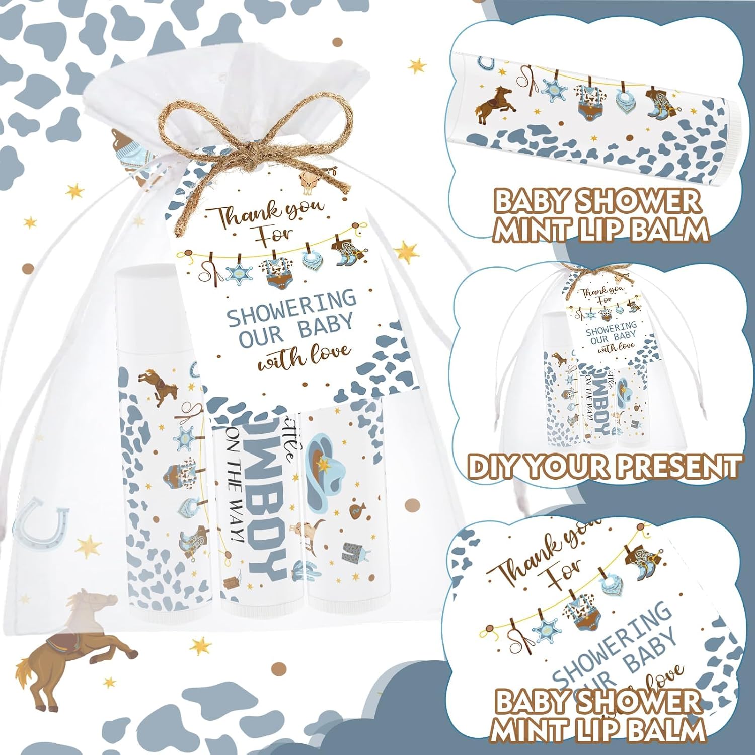Comprehensive Package: Our cowboy theme lip balm party favors include 50 lip balms, 50 organza bags and 50 thank you cards, adequate quantity can meet your gifting needs for baby shower, bridal shower or other parties