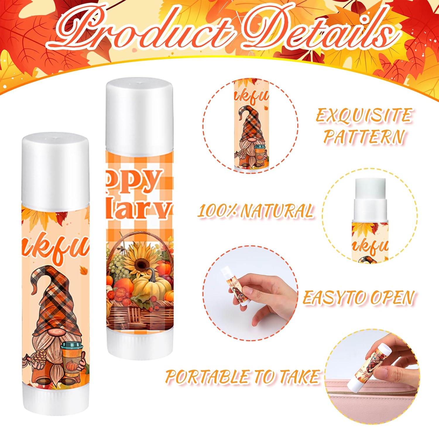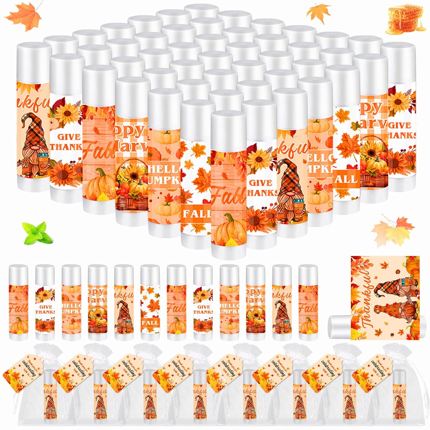 Bulk Fall Lip Balms: You will receive 50 moisturizing lip balms printed with six autumn-themed patterns and containing six refreshing flavors: honey, vanilla, mint, rose, strawberry, and jasmine. These lip balms help moisturize dry, chapped lips and come with 50 organza bags and 50 fall greeting cards, which you can share with your friends, colleagues, or family.