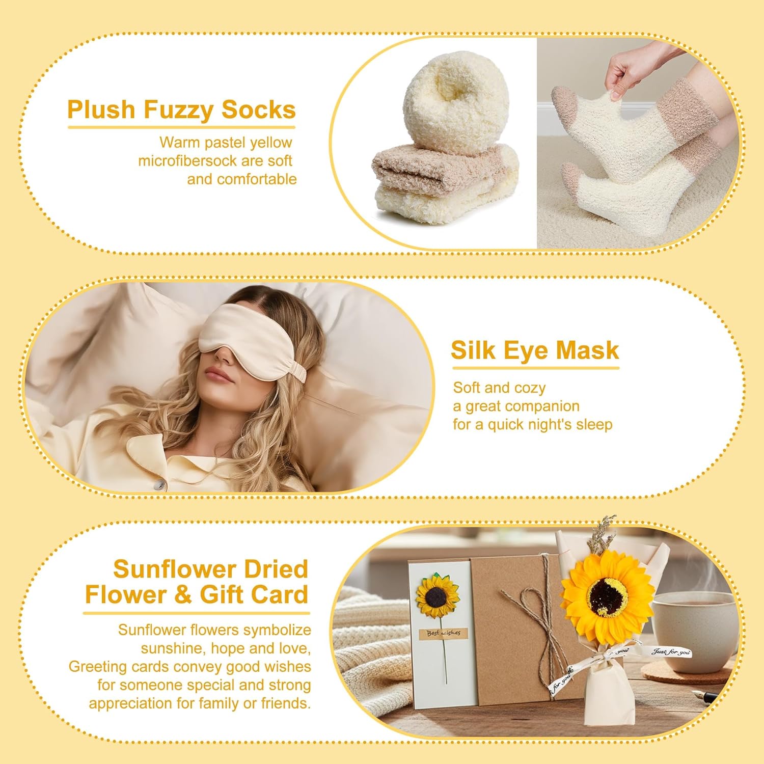 Get Better Soon Care Package for her: Get well soon gift basket is designed to make her feel warm and encouraged, smile design inside the gift box, gives positive energy, happy atmosphere and sunshine, A pair of super soft, comfort and warm fuzzy socks, keep warm and cozy all day long during recovery
