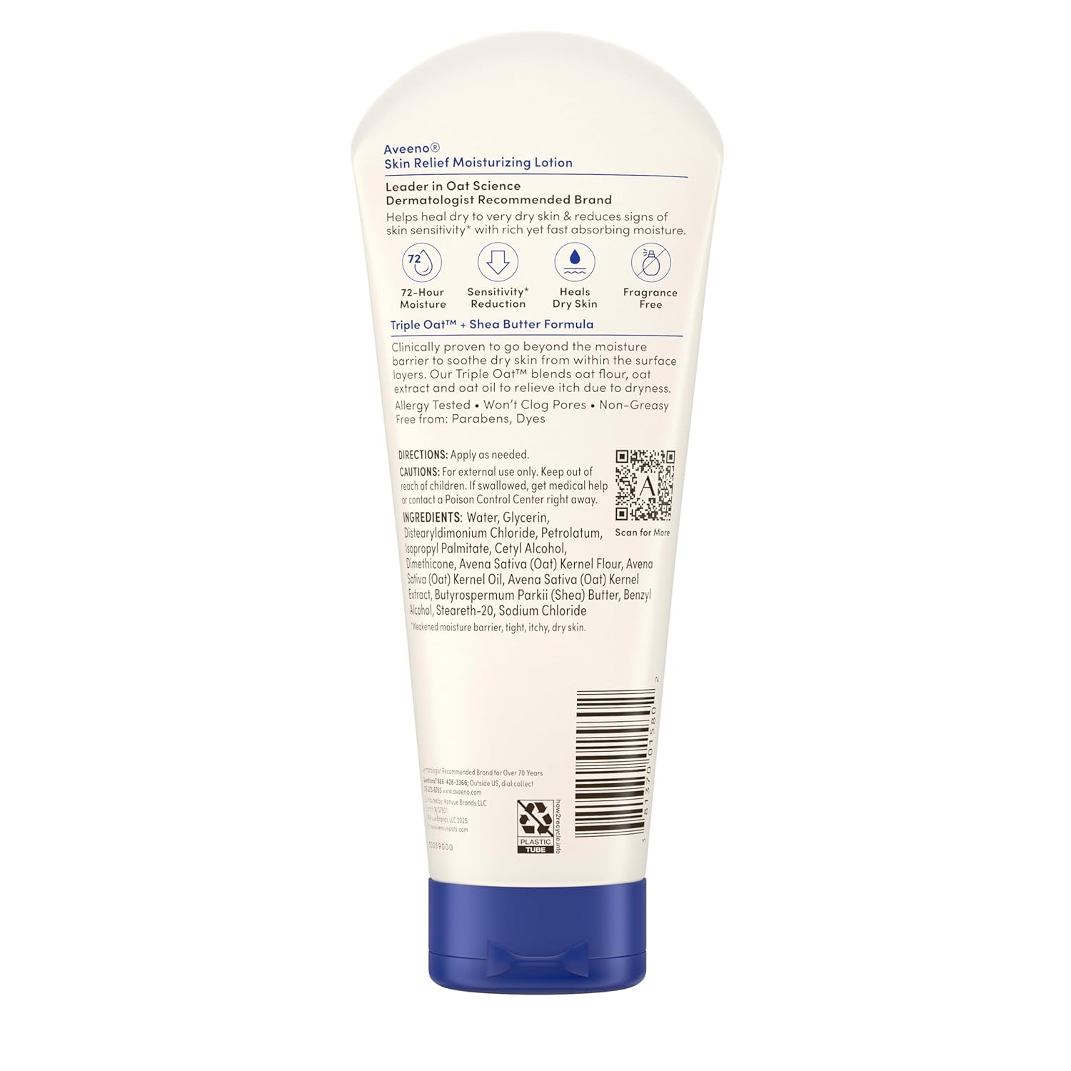 8 ounces of Aveeno Skin Relief Fragrance-Free Moisturizing Body Lotion with a soothing triple oat and shea butter formula helps heal very dry skin and reduces signs of skin sensitivity** with 72-hour* moisture
