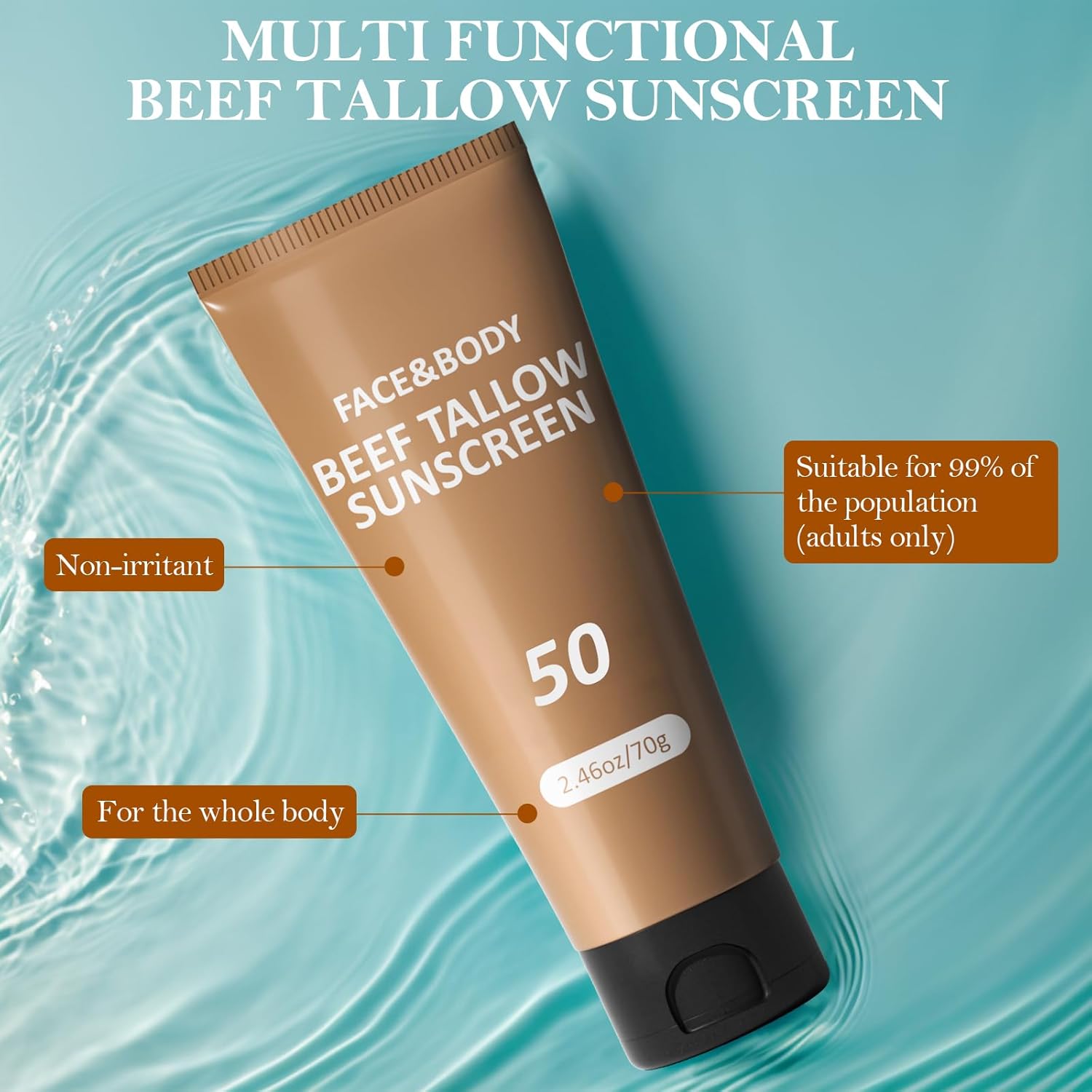 【Effectiveness】Our beef tallow sunscreen offers a skin protection. It ensures long-lasting protection during outdoor activities. The formula is non-sticky and absorbs quickly, leaving no white residue and preventing pores from clogging. Our sunscreen effectively shields skin from harmful ultraviolet rays. For optimal protection, we recommend using it in combination with other sunscreen products.