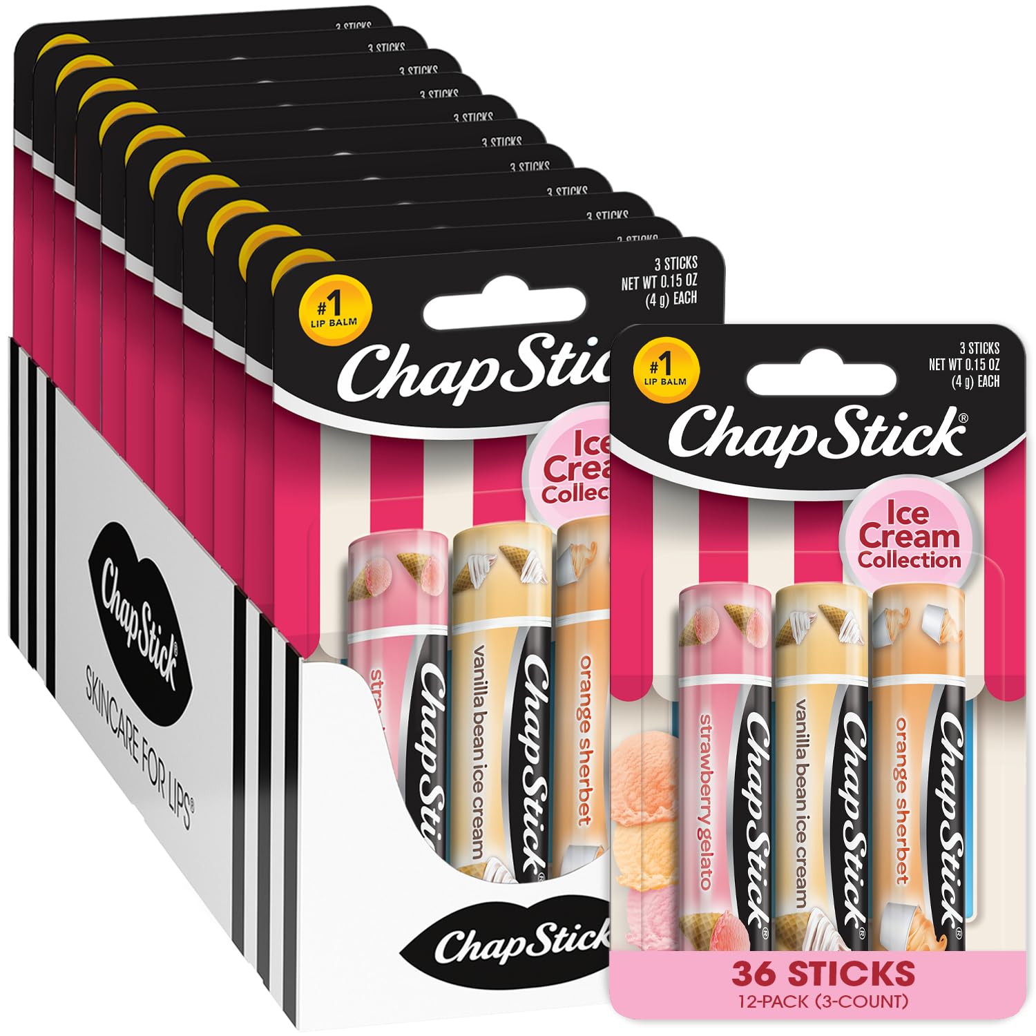 CHAPSTICK FAN FAVORITES: Make every day fun and delicious with twelve 3-packs of moisturizing lip balm sticks. Each set includes Strawberry Gelato, Vanilla Bean Ice Cream, and Orange Sherbet.