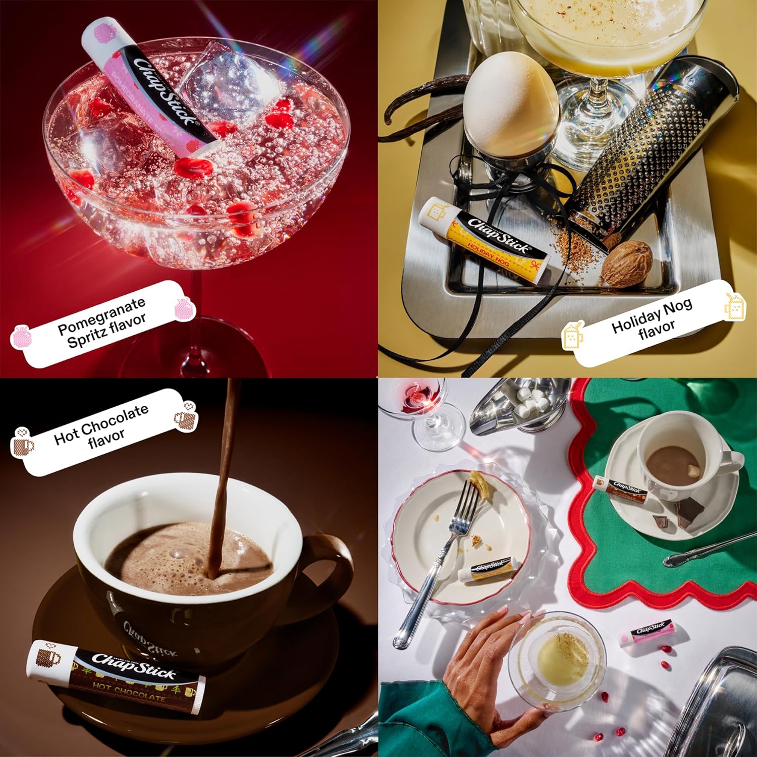 CHAPSTICKS FOR GIFTING: Celebrate the season with a cozy collection of ChapStick packs: Candy Cane and Sips & Snuggles (Holiday Nog, Pomegranate Spritz, Hot Chocolate) in holiday-themed packaging.