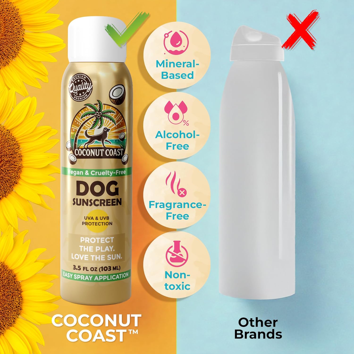 ALCOHOL-FREE, NON-GREASY FORMULA Unlike chemical sprays, our gentle coconut and aloe base absorbs fast without leaving residue. Perfect for sensitive skin, white-coated breeds, and short-haired dogs prone to sunburn.