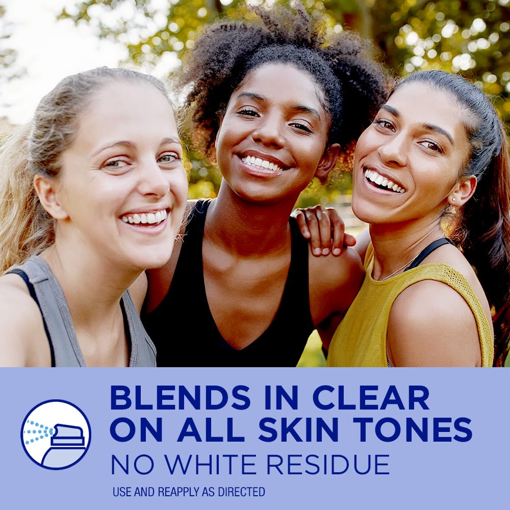 Blends in Clear Sunscreen No White Cast: Sunscreen spray with no white cast blends in clear on all skin tones, leaving behind no white residue