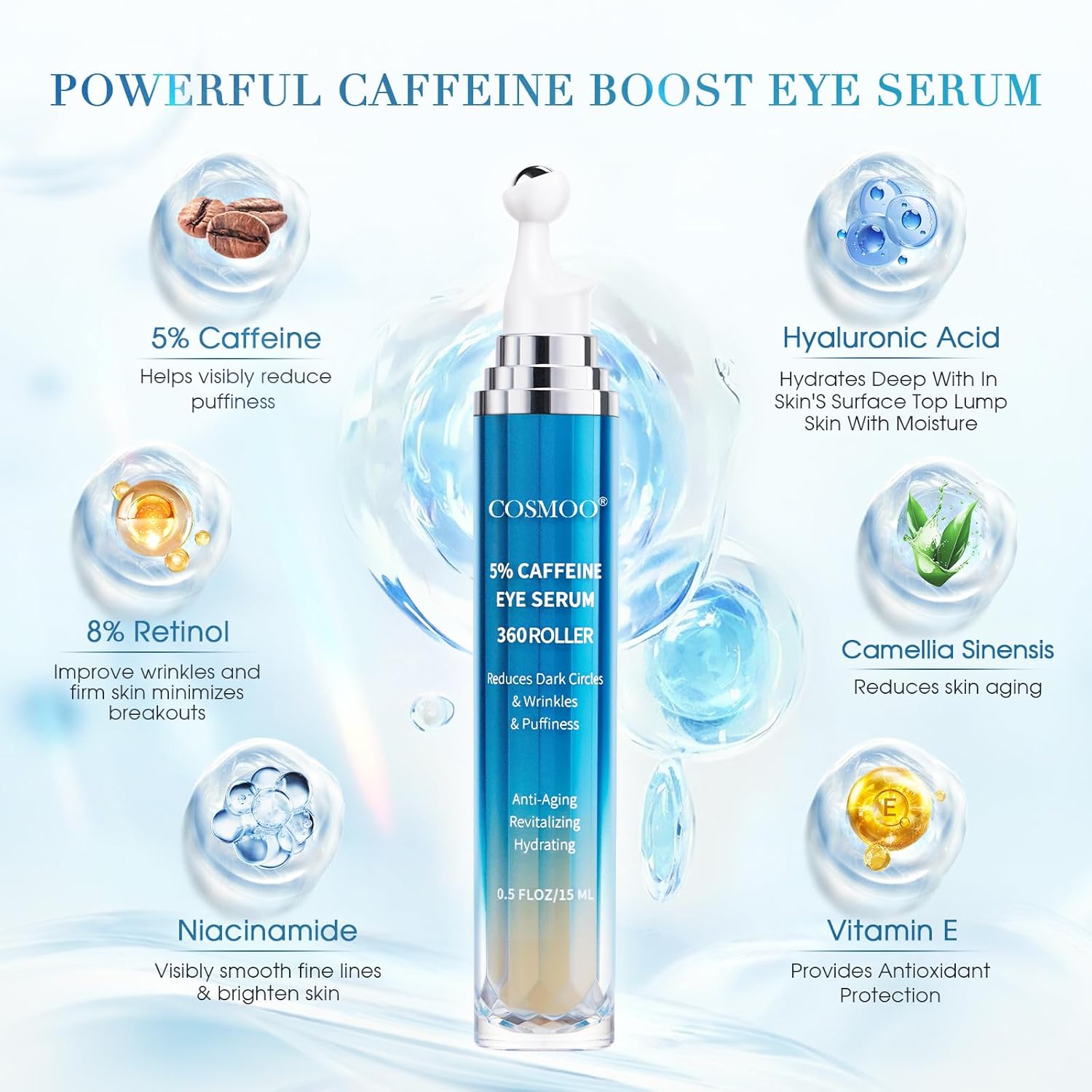 【Powerful Eye Serum 】Our caffeine eye cream with 5% caffeine and 8% retinol targets under-eye bags,puffiness and dark circles leaving your eyes refreshed and revitalized.