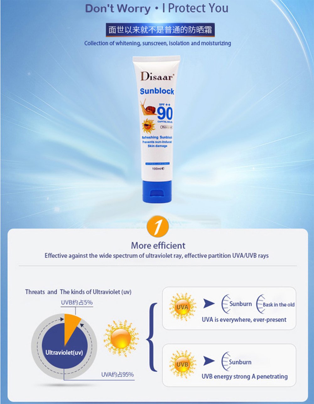 The new sunblock SPF 90 is mid in formula The all-round UVA/UVB protection and high-strength antioxidant ingredients protect you from UV and environmental damage