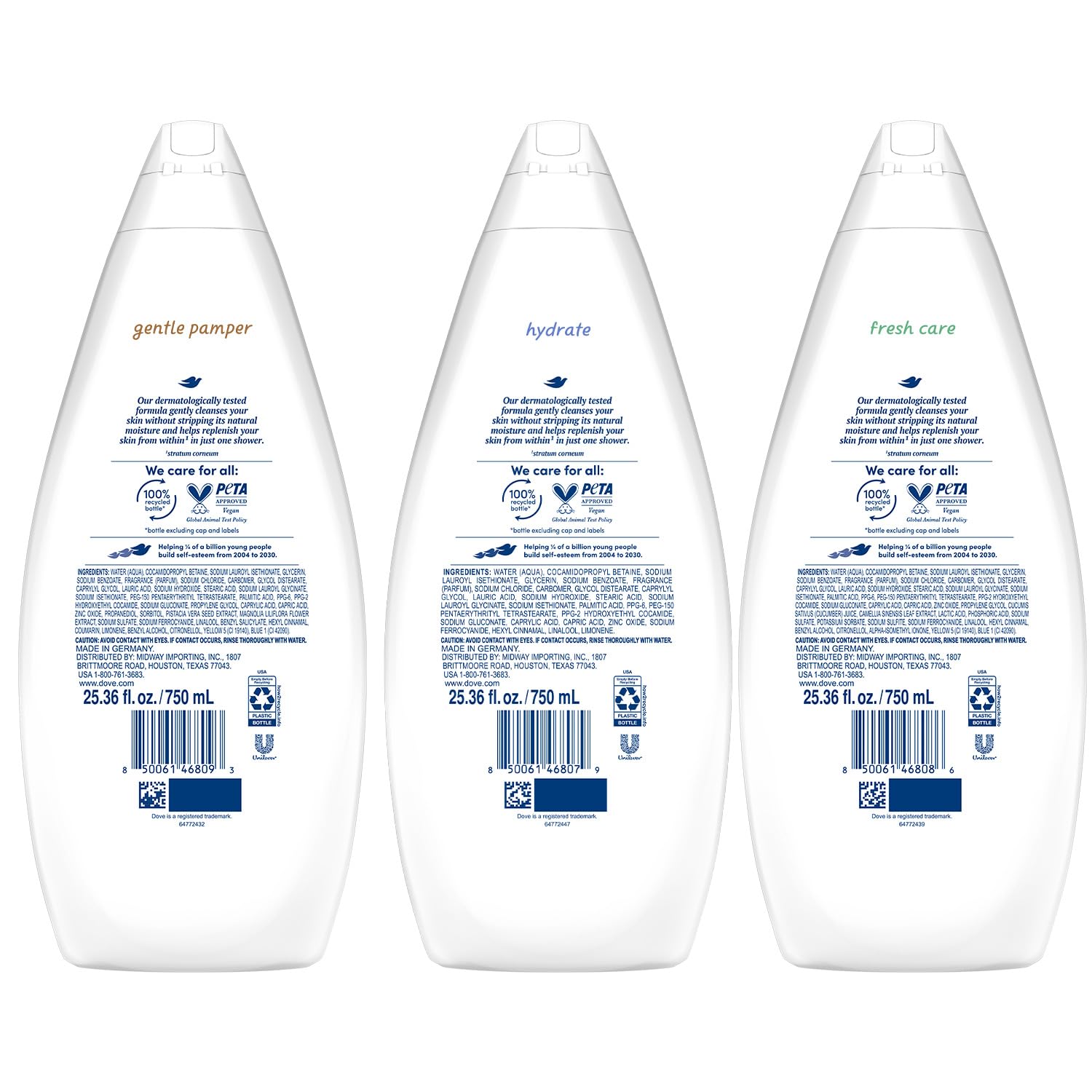 SHOWER ESSENTIALS: Stock up on your favorite Dove liquid body soaps. This bundle includes one large squeeze bottle each of Hydrate, Fresh Care, and Gentle Pamper.