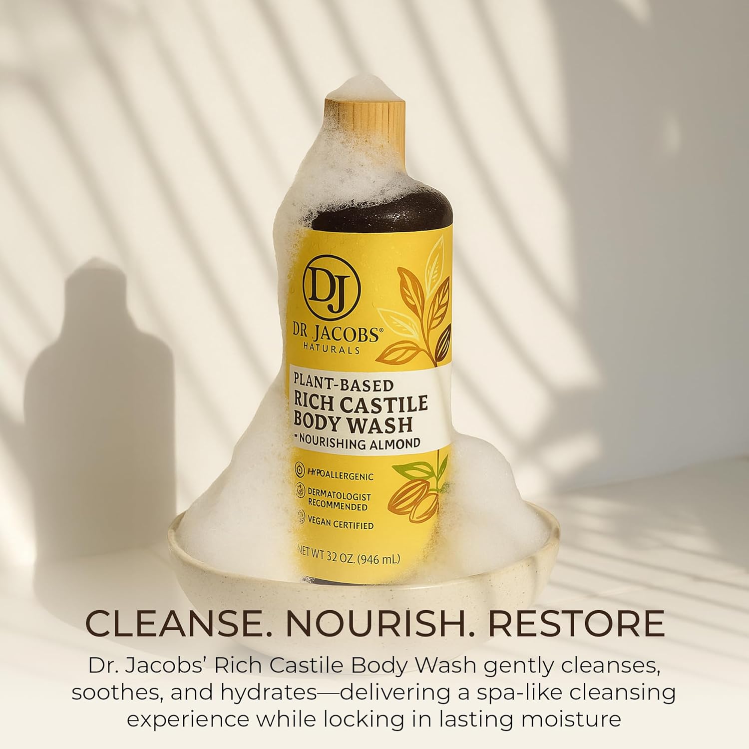 Skin-Soothing Luxury: Experience Dr. Jacobs Naturals’ Castile body wash, a unique blend with natural plant-based ingredients. It pampers your skin with a lavish, nurturing shower, in a thick, concentrated formula. It's all about indulgence in every wash.