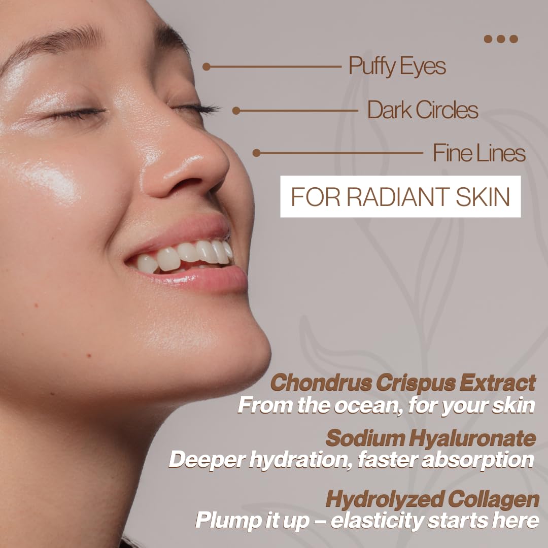 Hydrating & Soothing Formula Infused with marine collagen, hyaluronic acid, and moisturizing plant extracts to deeply hydrate delicate under-eye skin.