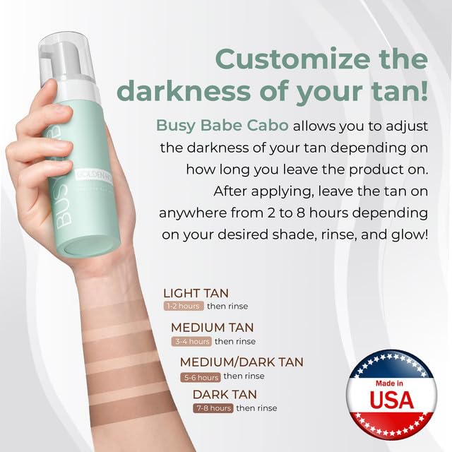 SEAMLESS APPLICATION: Experience a hassle-free application process with Busy Babe Golden Hour Rapid Bronze sunless tanner. Provide a streak-free finish every time, so you can flaunt your luminous radiance with confidence. Made with a unique blend of ingredients, our foam tanning mousse ensures faultless results, leaving you with a flawless tan that lasts. Say goodbye to streaks and hello to flawless radiance with Busy Babe.