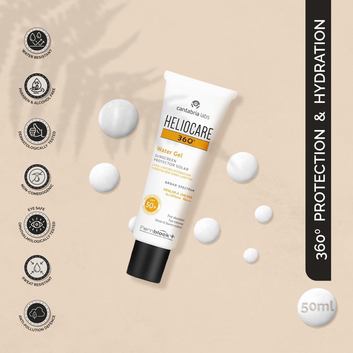 Helio-care 360º Water Gel SPF 50+ PA++++ Sunscreen | Ultra-Light, Hydrating Sunscreen for Dry & Dehydrated Skin | Hyaluronic Acid | Water & Sweat Resistant | No White Cast | 50ml