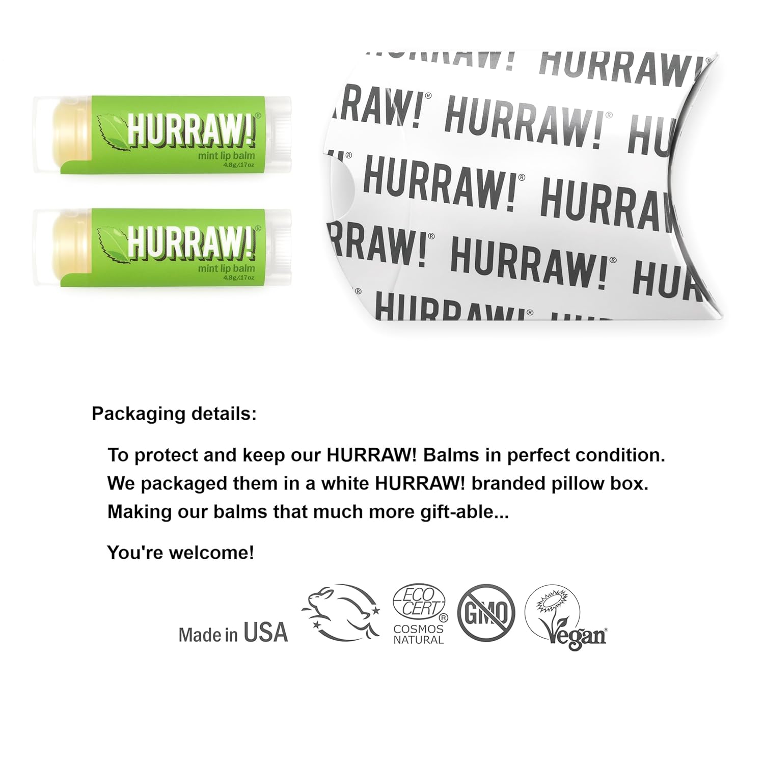 THREE 4.8g/.17oz Oval Tubes of Mint Lip Balm packaged in a white HURRAW! branded pillow box. Awesome tingle and crisp and a long lasting minty treat for your lips! The icy scent of our mint lip balm reminds us of those 1970's peppermint patty commercials (swoon). Made with certified organic, vegan, and raw ingredients. Hurraw! Lip Balms are certified 100% all natural origin, cruelty and gluten free. Non-GMO. Bee, Shea, Soy and Palm Free.