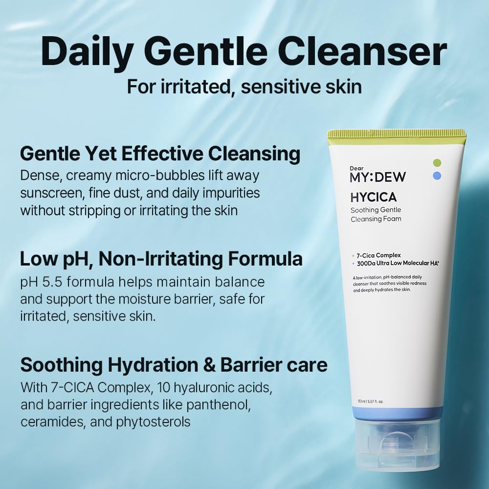 Calming & Hydrating Gentle Cleanser : Pearl-like creamy foam with dense micro-bubbles, 7-CICA Complex & 10-Hyaluronic Acid gently removes makeup, sunscreen, fine dust & impurities while delivering soothing moisture.