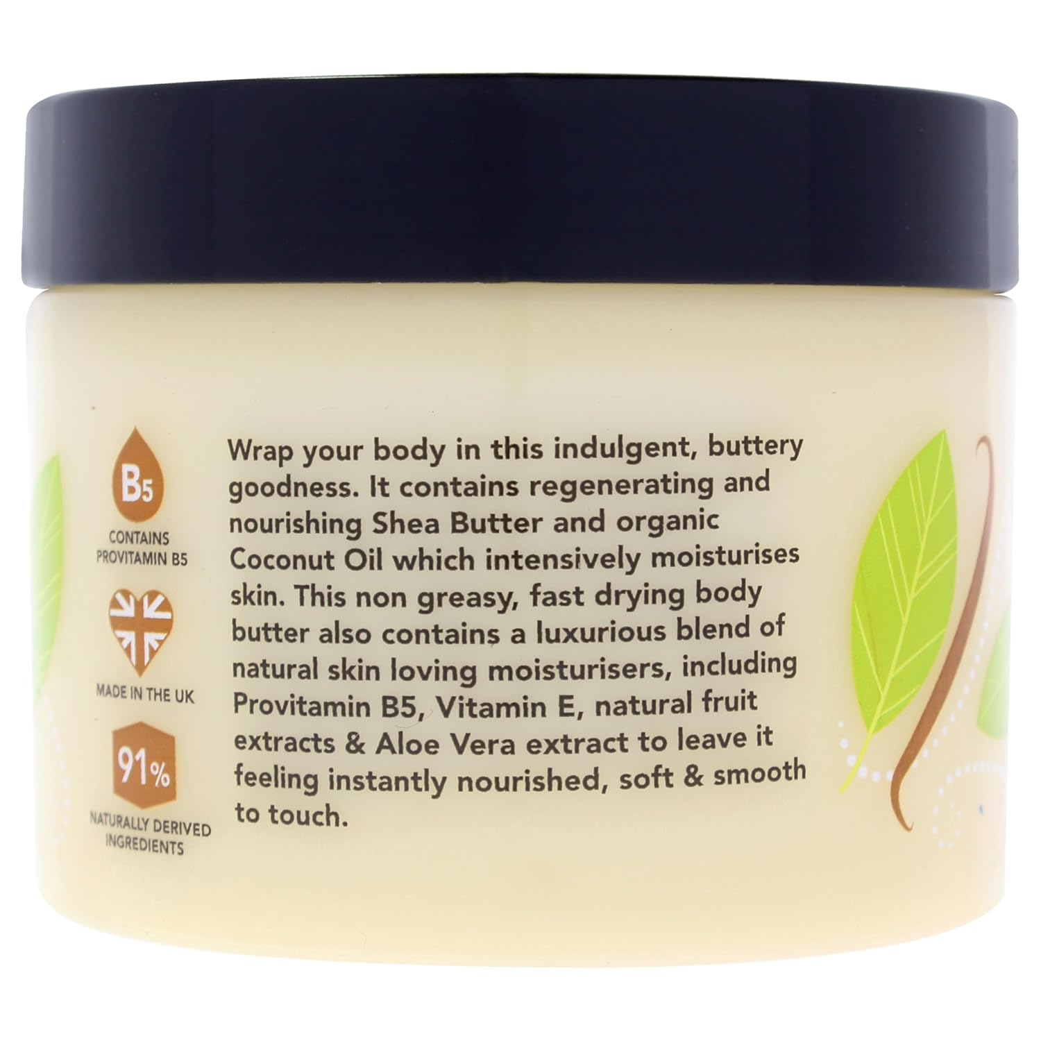COCONUT OIL AND SHEA BODY BUTTER. This non-greasy, fast-drying body butter contains a luxurious blend of natural, skin-loving moisturizers, including provitamin B5, Vitamin E, Aloe Vera, and natural fruit extracts, leaving skin soft to the touch.