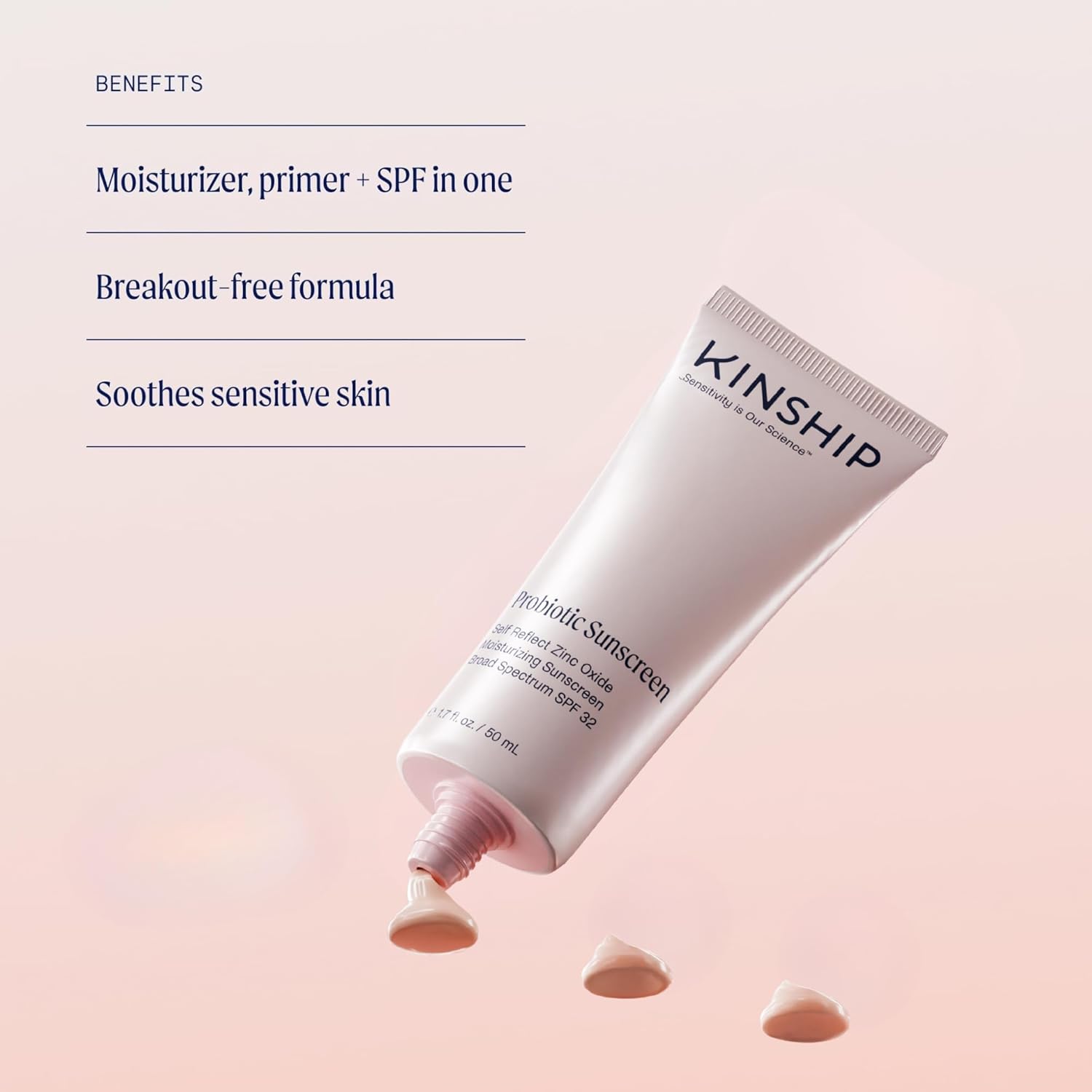 NOURISH + PROTECT - Beyond sun protection, Kinship Self Reflect SPF 32 is infused with turmeric and Kinbiome, our patented plant-based pre-probiotic technology. These powerhouse ingredients work together to soothe and nourish your skin, strengthen the skin barrier, and support a clear, glowing complexion, making this sunscreen a vital part of your skincare routine every day of the year.
