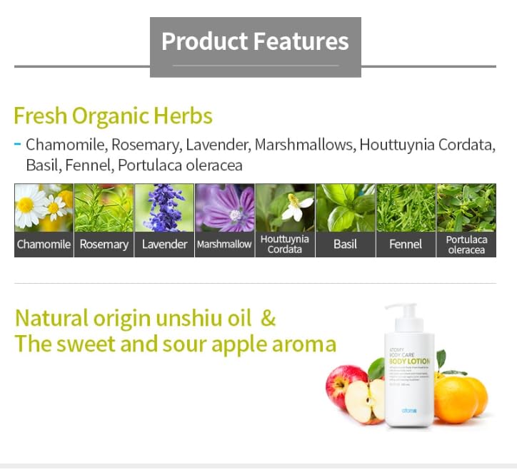 Atomy Body Lotion contains 9 kind of fresh herbs, tangerine oil (Unshiu) and apple water to refresh your tired skin and to keep your skin moisturized and smooth! Herbs extract embraces dried skin and gives elasticity and vitality to the skin.