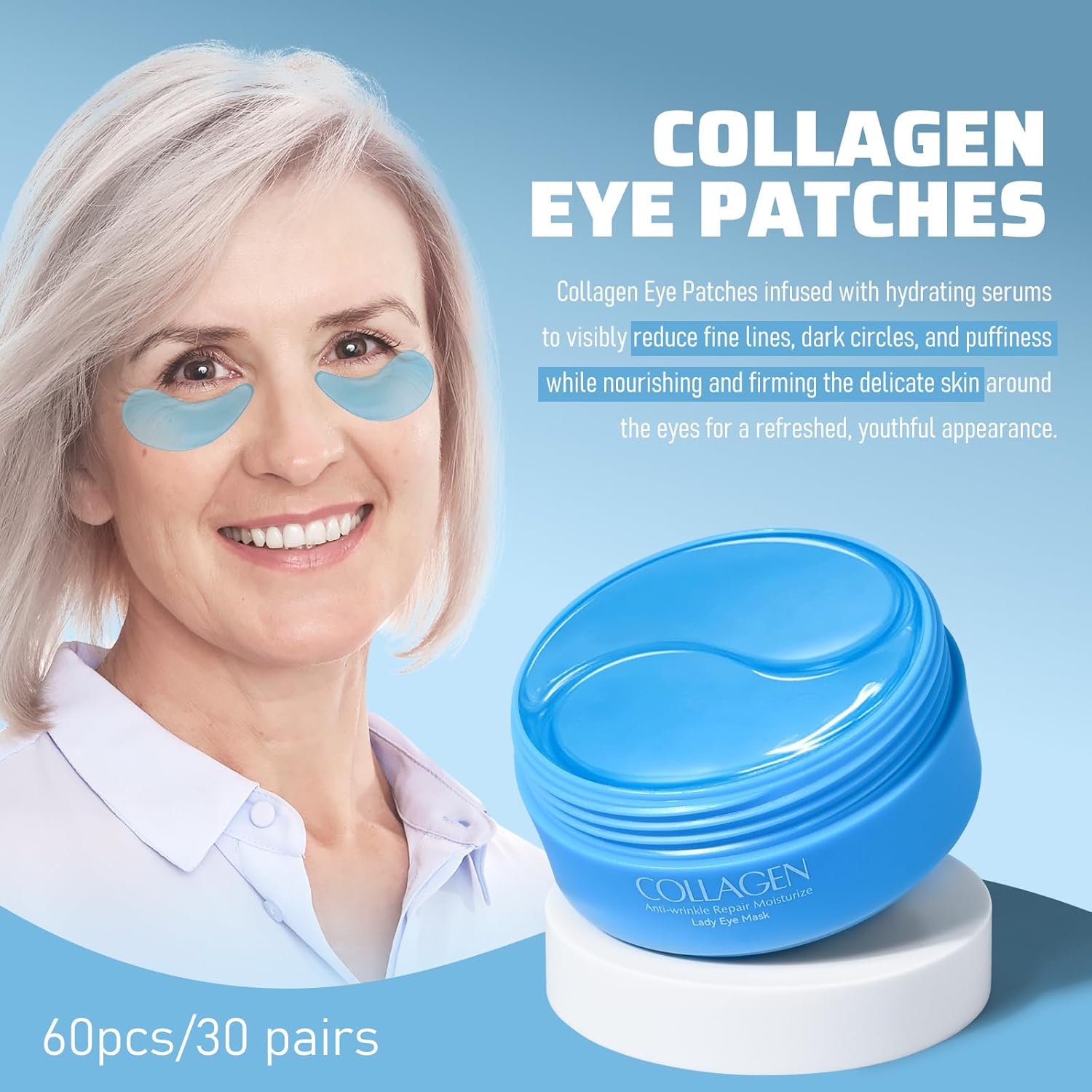 KYDA 60 Pcs Collagen Under Eye Patches for Older Women, Hydrating & Moisturizing Eye Mask Anti Aging Eye Patches for Puffy Eyes, Eye Liners and Dark Circles(60pcs)