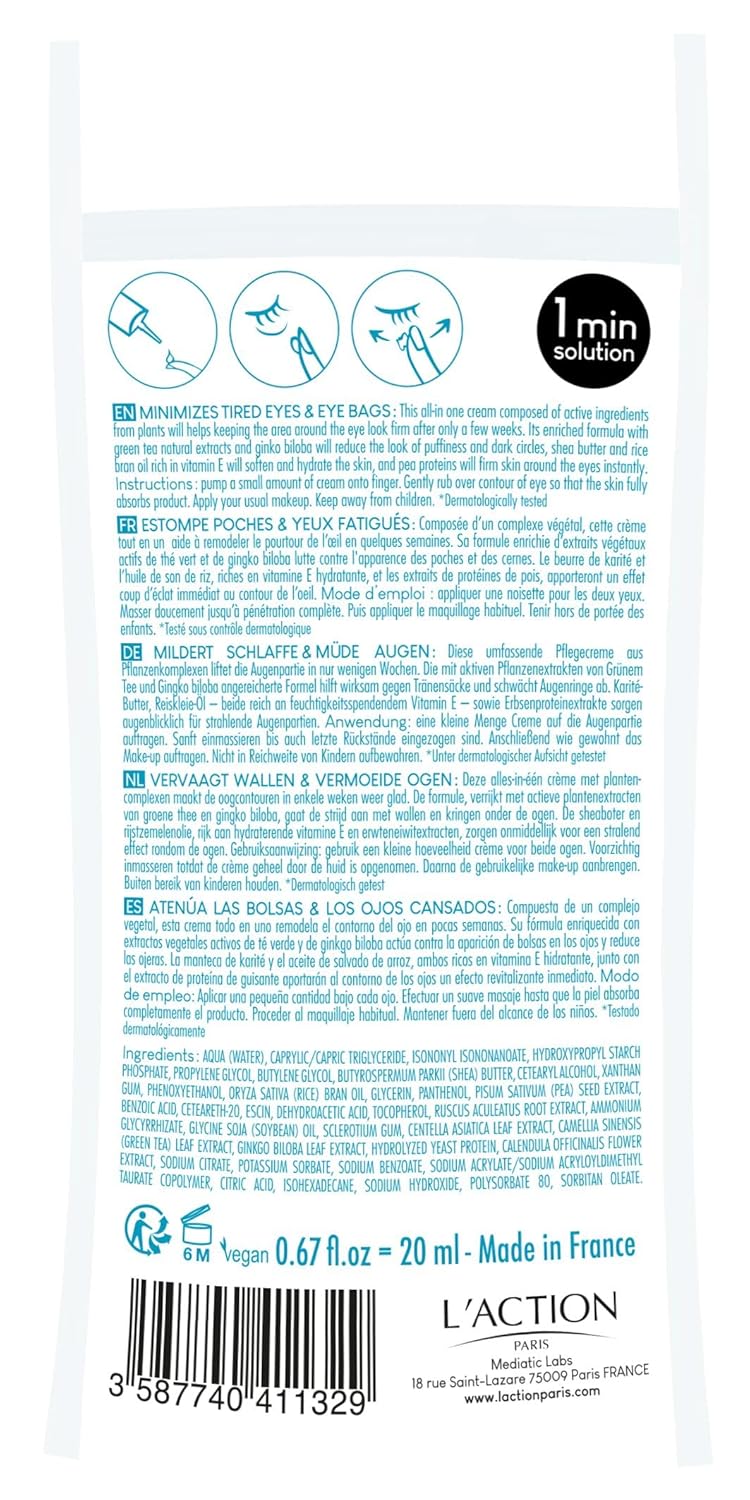 L'Action Paris All In One Eye Bag Minimiser, Natural Plant Based Cream Minimises Tired Skin and Eye Bags, Vitamin E Softens and Hydrates, Youthful Complexion, 20ml