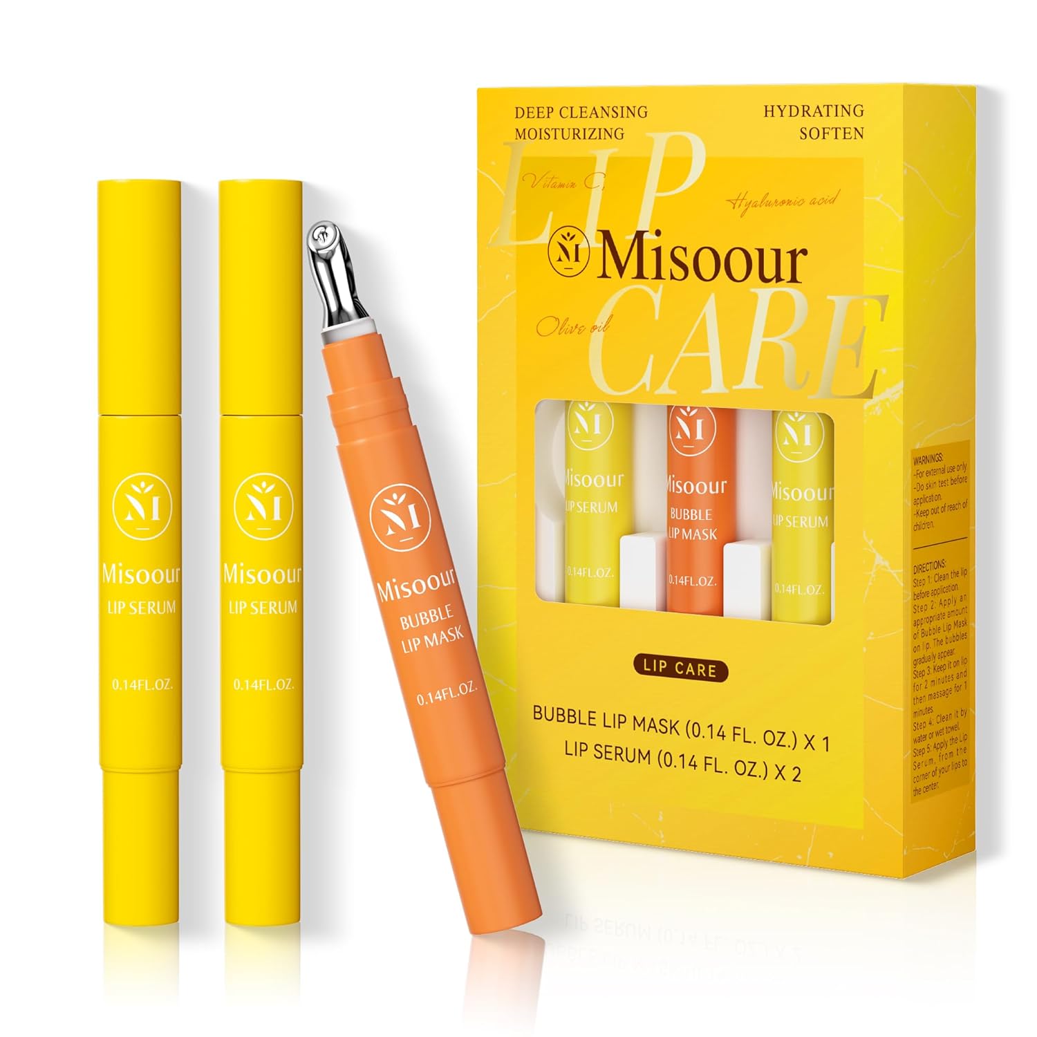 Lip Serum & Bubble Lip Mask, with Hyaluronic Acid, Vitamin C & Squalane Plumping Lip Treatment, Nourishing Overnight Lip Balm, Hydrating, Exfoliating Lip Scrub Alternative (0.14Fl.Oz, 3-Piece)