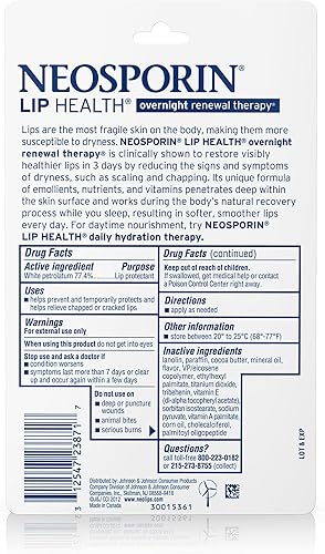 Twin pack containing two 0.27-ounce tubs of Neosporin Lip Health Overnight Renewal Therapy Lip Protectant with white petrolatum to help hydrate and nourish your lips, the most fragile skin on your body