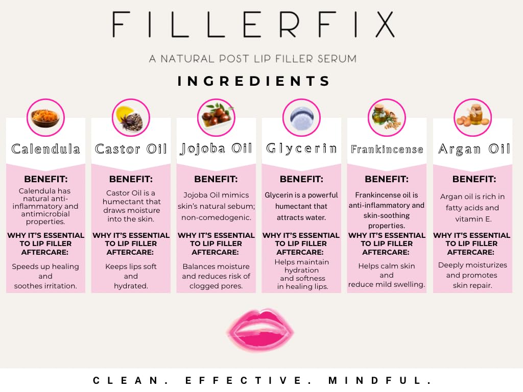 PREMIUM ORGANIC AFTERCARE FOR LIP FILLER – Specially formulated for post-lip filler recovery, FillerFix nourishes and soothes with healing botanicals like arnica, calendula, and marula oil—without petroleum or synthetic chemicals.