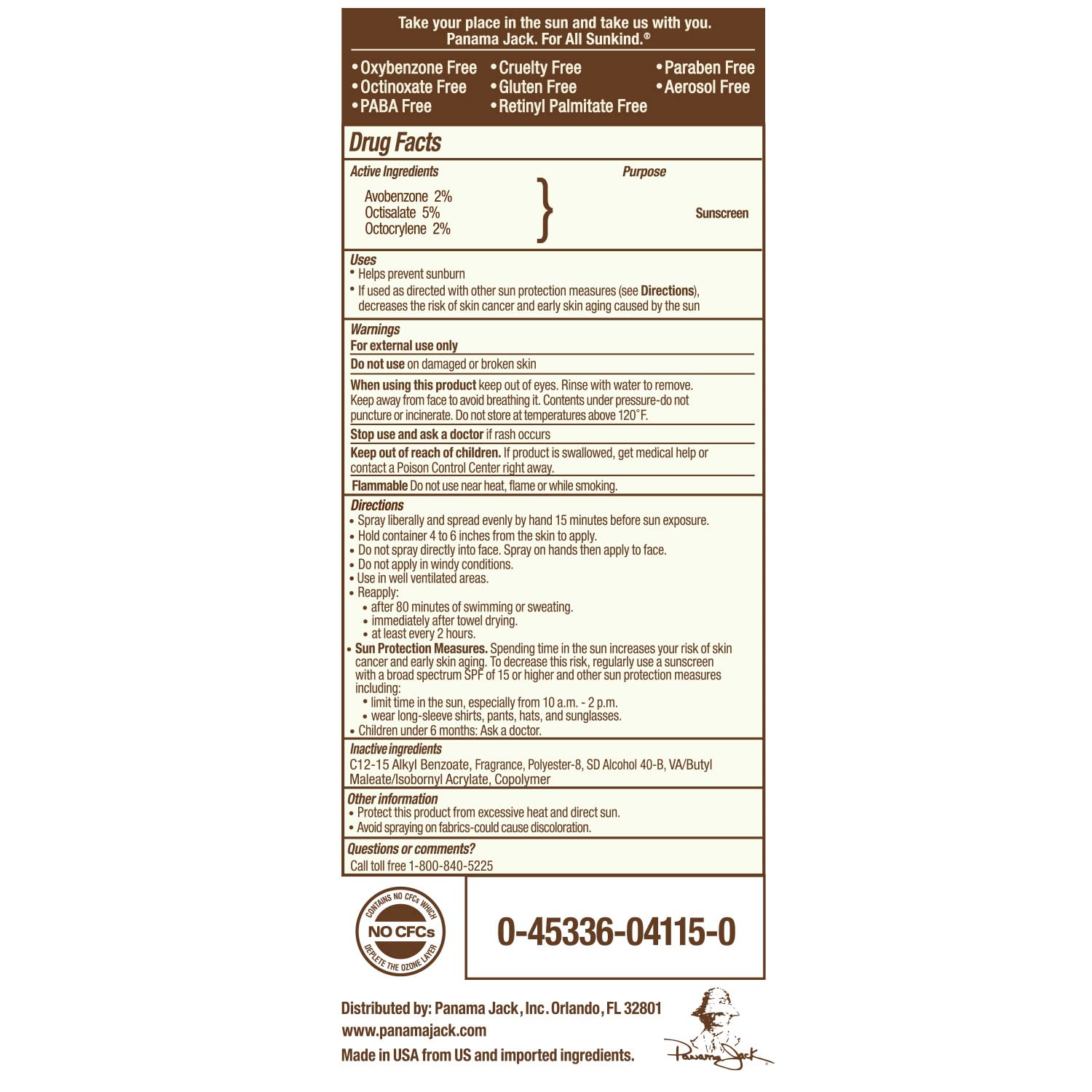 MULTI-ACTION FORMULA: Our Panama Jack continuous SPF 15 sunscreen spray delicately combine antioxidants with moisturizing oils and a tropical fragrance in an Oxybenzone and Octinoxate Free, Broad Spectrum UVA/UVB formula