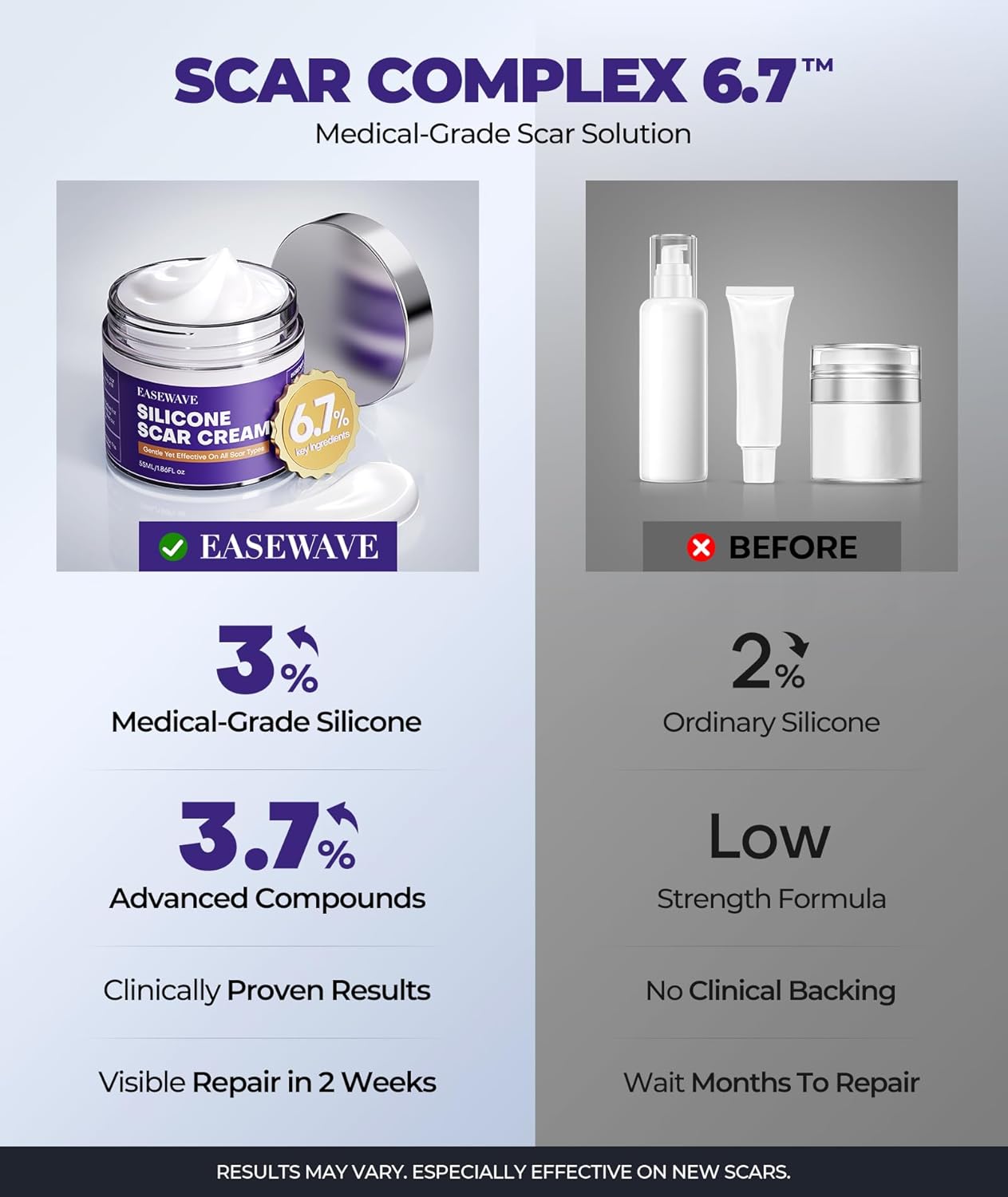 WATCH NEW SCARS FADE IN JUST 2 WEEKS! Tired of waiting months for scar results? So were we. That’s why we created EASEWAVE Ultimate Scar Cream, an upgraded formula powered by 6.7% active complex (3% medical-grade silicone + 3.7% advanced compounds). It targets scars from surgeries, C-sections, burns, acne, and pregnancy stretch marks. While other scar creams keep you waiting, EASEWAVE scar removal cream delivers visible improvements in as little as 2 weeks—especially on new scars. Stop wasting time-restore your skin faster, rebuild confidence, and wear what you love again, and on your terms.