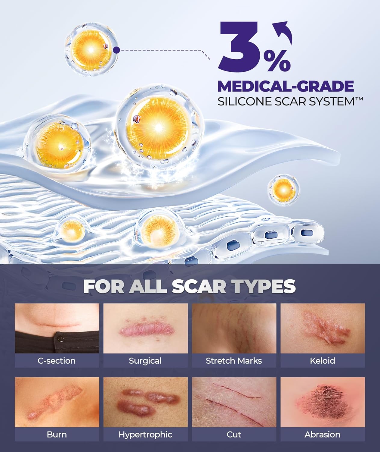 START NOW - MAKE SCAR-FREE YOUR NEW REALITY. Manufactured in GMP-certified & FDA-registered facilities under strict quality standards, silicone scar gel is designed for everyday use to help reduce the appearance of scars. Apply 2–3 times a day. New scars improve in 2–8 weeks; old scars improve in 3–6 months. Results may vary. For next-level results, pair the scar gel with silicone scar sheets, scar tape, burn cream, scar oil, bruise cream, or a scar stick. This scar cream is intended to improve the appearance of scars only and is not intended to diagnose, treat, cure, or prevent any disease.