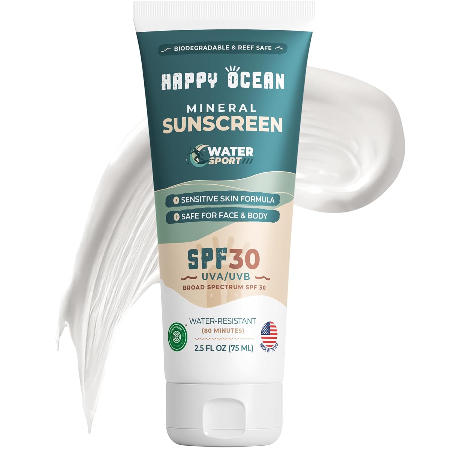 BEST SPORT SUNSCREEN FOR ACTIVE LIFESTYLES: Happy Ocean SPF 30 Sport Mineral Sunscreen is water-resistant and designed for active lifestyles. Stay protected during intense outdoor activities, from hiking to swimming and more.