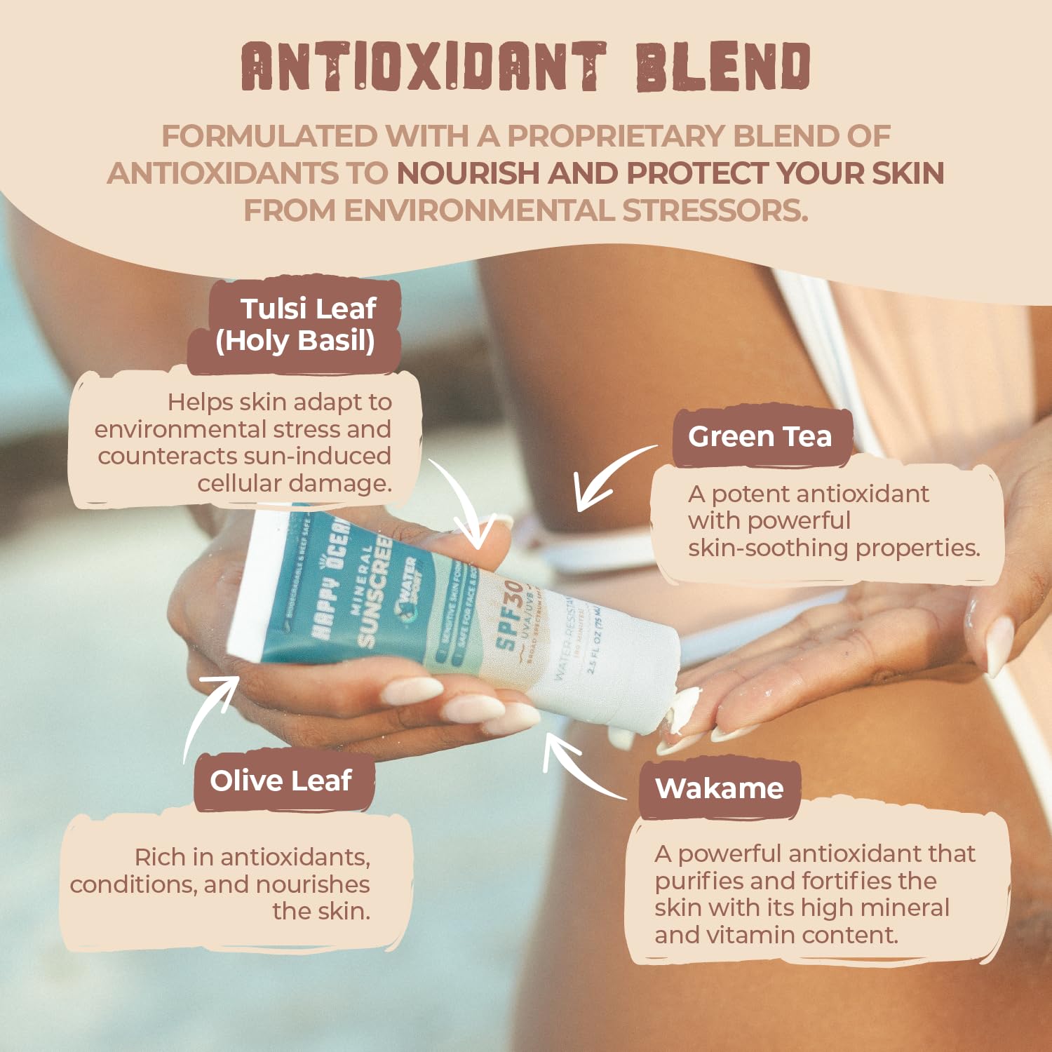 WATER RESISTANT SPF 30 SUNSCREEN FOR WATER SPORTS: Happy Ocean SPF 30 Sport Mineral Sunscreen offers up to 80 minutes of water resistance, perfect for swimming, surfing, and other water sports. Protect your skin with ease.