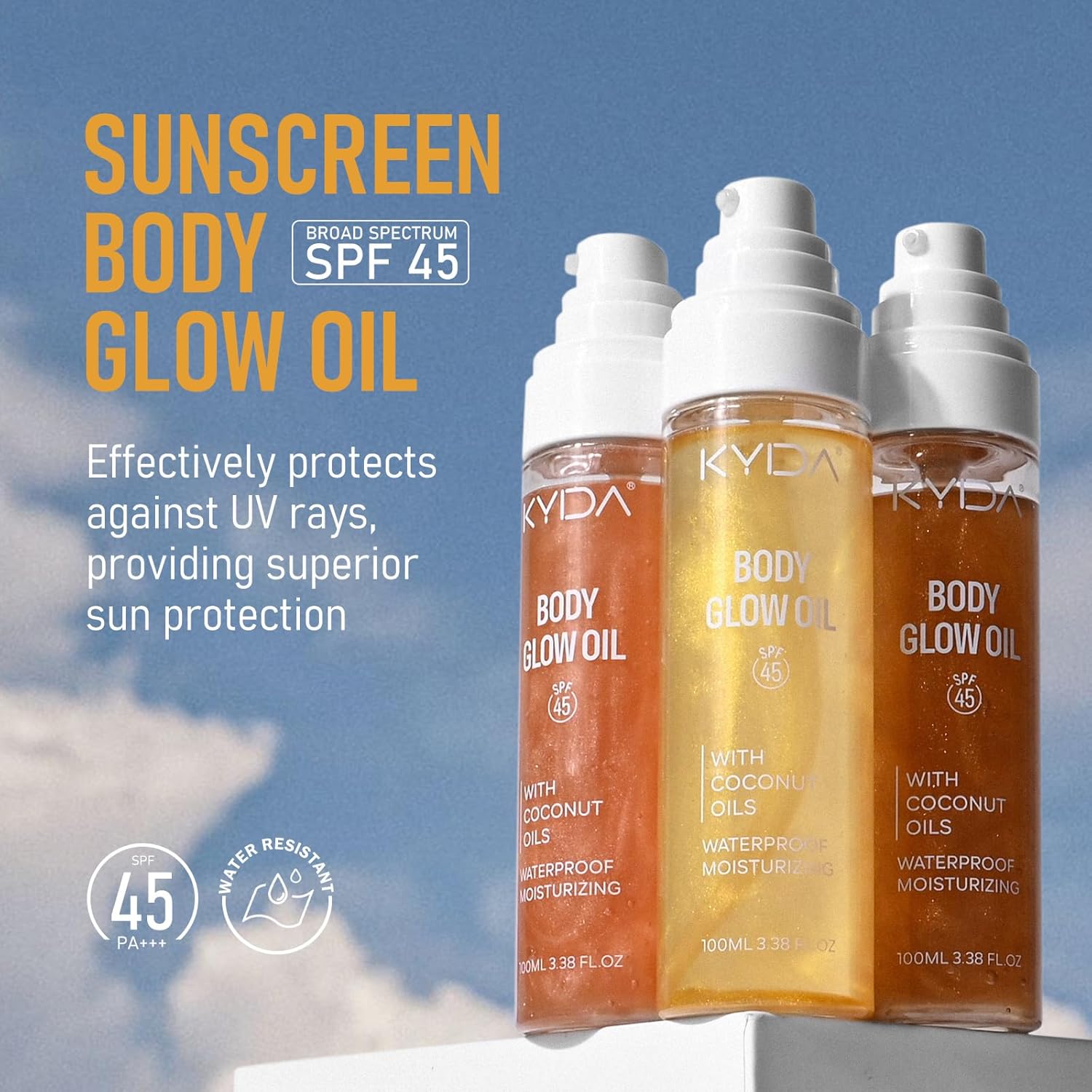 Sunscreen Body Glow Oil, Broad Spectrum SPF 45, Lightweight Water Resistant Shimmering Body Oil with Gold Mica, Non-Sticky Glow Moisturizer with Coconut-AMBER, 3.38 fl oz(3# AMBER)