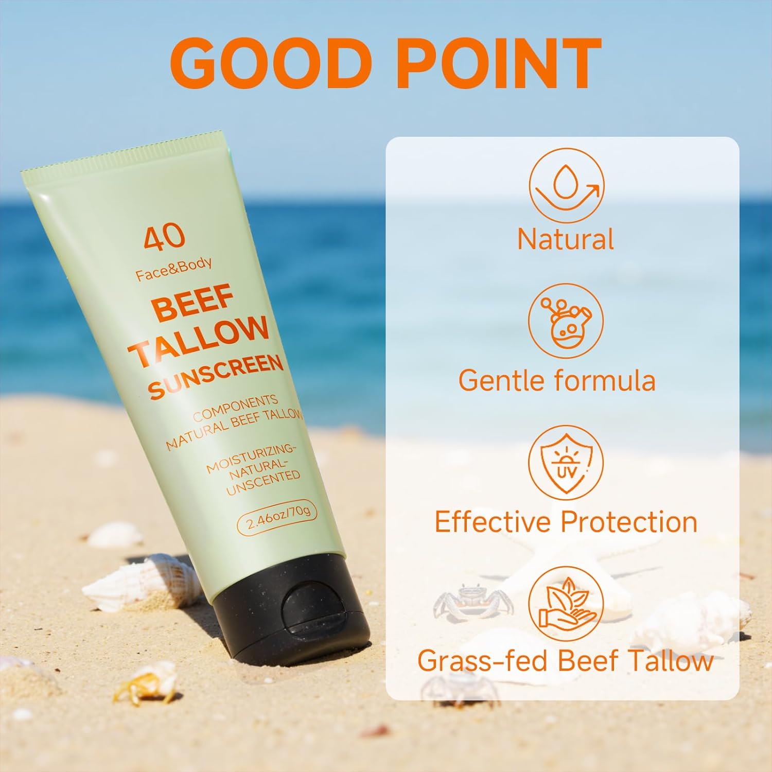 【Natural & Nutrient-Rich Formula】 Crafted with tallow sunscreen, this travel sunblock harnesses grass-fed beef tallow for skin, a natural emollient packed with vitamins A, D, and E. Unlike synthetic ingredients, beef tallow mimics skin’s lipids, ensuring deep hydration and compatibility for all skin types. The beef tallow sun screen formula is minimally processed, free from artificial fragrances, and tallow sunscreen ideal for reactive skin, offering a nourishing barrier.